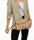 The Portia Hoop Crossbody is all about statement-making shine. This sleek faux leather bag puts glamorous gold-tone hardware front and center, featuring a bold oversized ring with tassel detail that adds instant edge. Slim and structured, it’s perfect for evenings when you want just the essentials — without carrying a bulky bag. Finished with a soft pebble-grain exterior, black trim, and champagne gold hardware, it’s polished, modern, and undeniably cool.