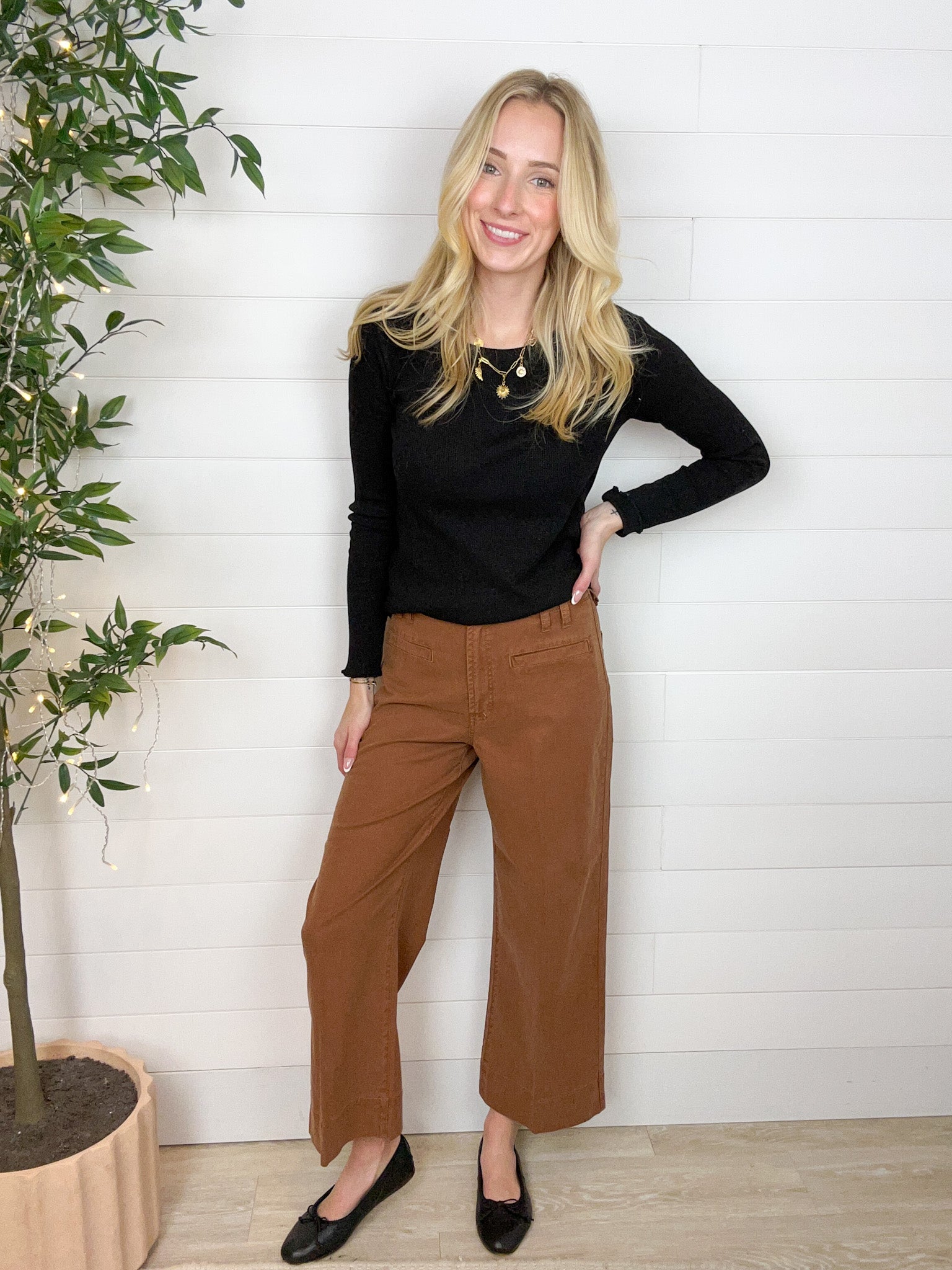 Meet the Liverpool Mocha Crop Wide Legs — the perfect balance of polish, comfort, and effortless cool. Crafted in a premium mocha twill with just the right amount of structure, these trousers feature a genius elastic-back waistband that gives you a tailored look and all-day ease. Chic, flowy, and incredibly flattering.