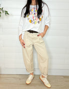 The Made in Italy Pleated Trousers w/ Belt strike that perfect balance between polished and laid-back. Designed in a soft sand hue with a subtle safari-inspired vibe, these trousers feature gentle pleating and a slight barrel leg for modern shape without feeling exaggerated. An elastic waist keeps them comfortable, while belt loops accommodate the included dark brown belt for a styled, pulled-together finish. Made in Italy with beautiful fabric and an easy drape, theyโre chic, versatile, and endlessly wearable.