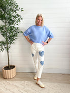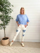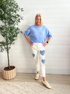 The Made in Italy Contrast Heart Patch Skinny Jeans are a true standout piece with thoughtful, artful detail. Crafted in crisp white denim, these skinny jeans feature blue denim heart appliqués with an abstract rose design inside — a unique contrast that feels both romantic and modern. Made with stretch for all-day comfort and finished with sleek silver hardware, they hug just right while still feeling easy to wear. Designed and made in Italy, they bring elevated style with a playful twist.