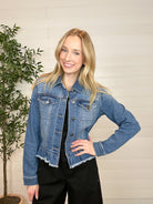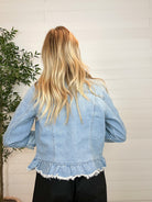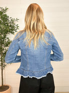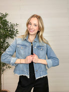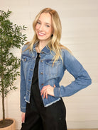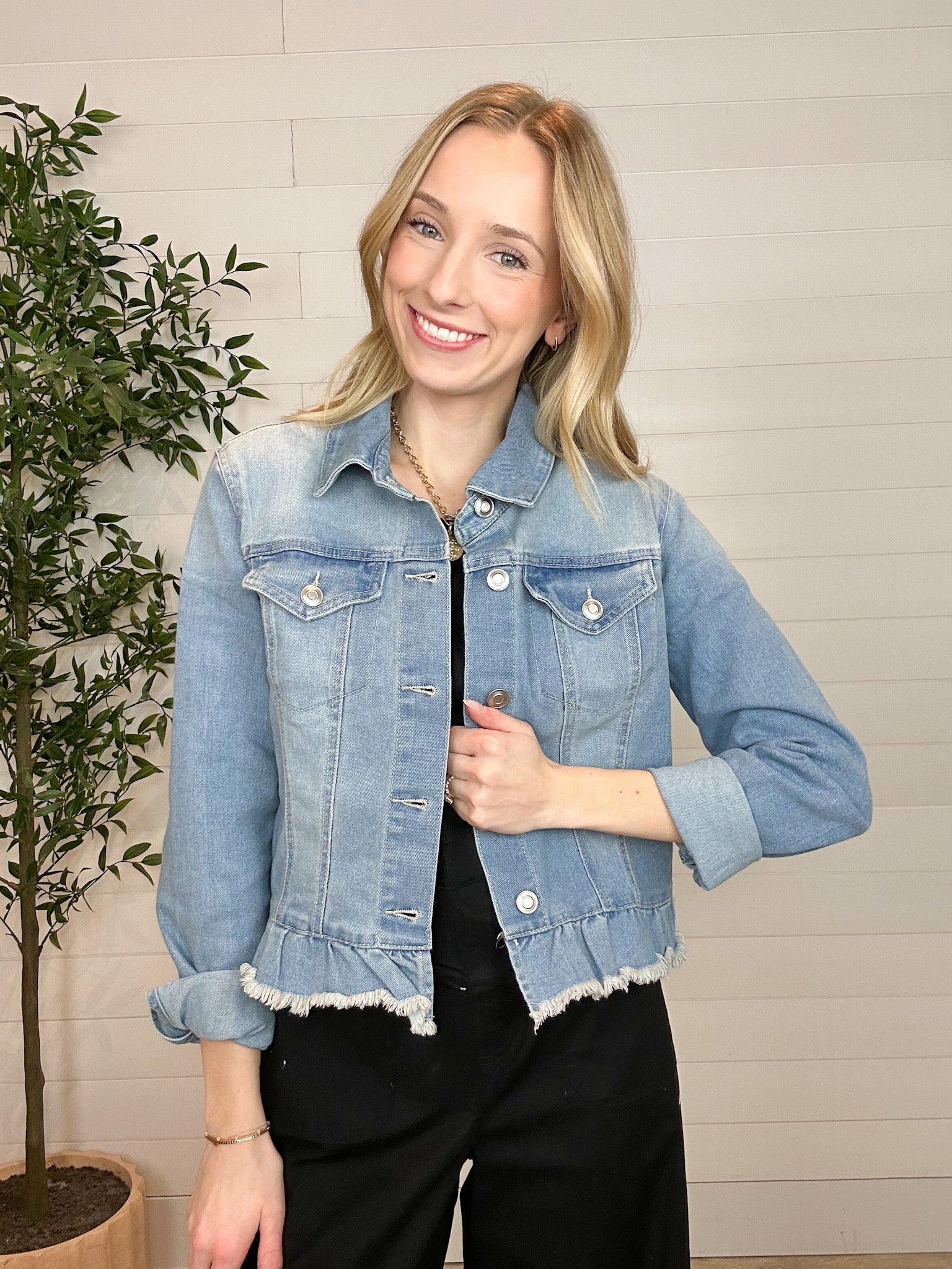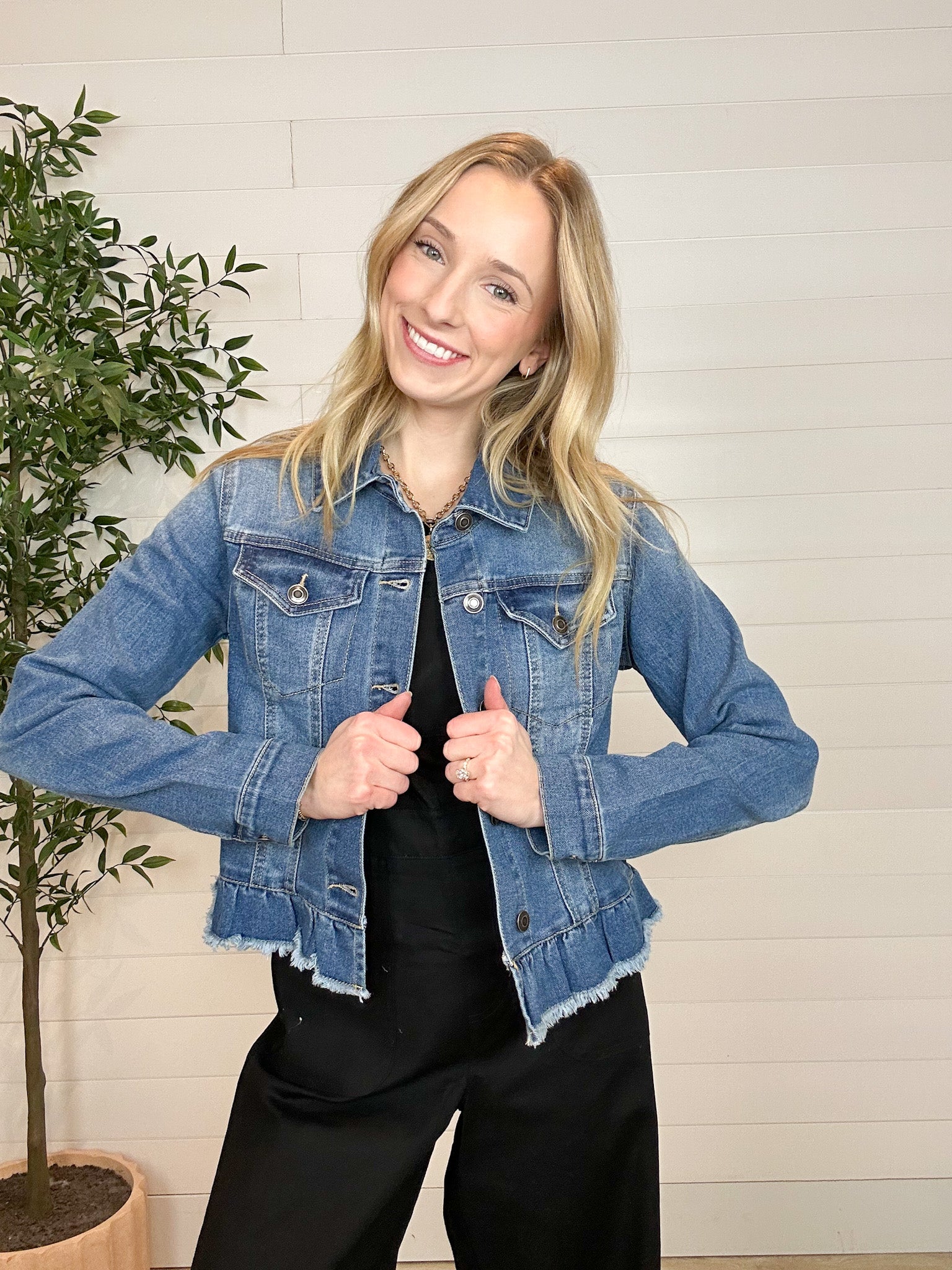 The Peplum Hem Denim Jacket puts a fresh spin on a timeless layer. Designed with a flattering split peplum hem and subtle frayed edges, this jacket adds shape and style without losing that classic denim feel. The structured spread collar, button-down front, and chest pockets keep it traditional, while a touch of stretch makes it comfortable for all-day wear. Polished yet playful, itβs the perfect finishing layer for dresses, denim, and everything in between.