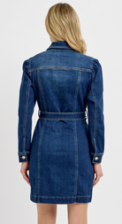 This puff sleeve denim dress takes a timeless fabric and gives it a chic, tailored update. Designed with flattering princess seams and a just-above-the-knee cut, it balances structure with ease. A matching denim belt cinches the waist, while puff sleeves and breast pockets add playful, utility-inspired charm. And yes—it has pockets!