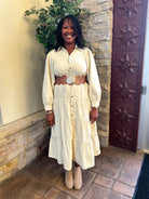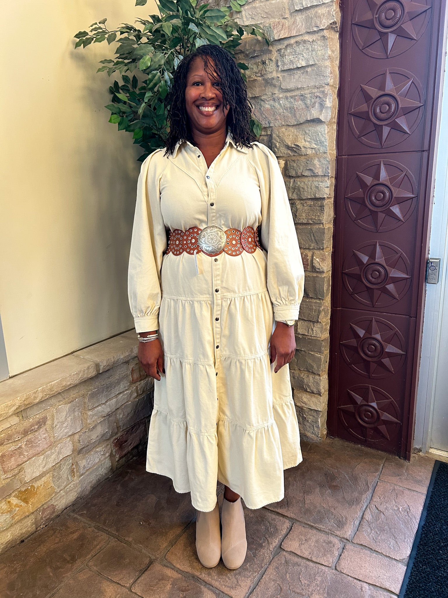 Who says corduroy can’t be flirty? This tiered maxi dress is the perfect blend of sturdy structure and feminine charm. With its puff sleeves, flowy tiered skirt, and adjustable waist tie, it flatters while keeping things effortlessly cool. The snap-button front and handy side pockets bring in that utility-inspired edge—so it’s as practical as it is pretty.
