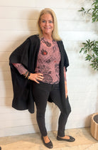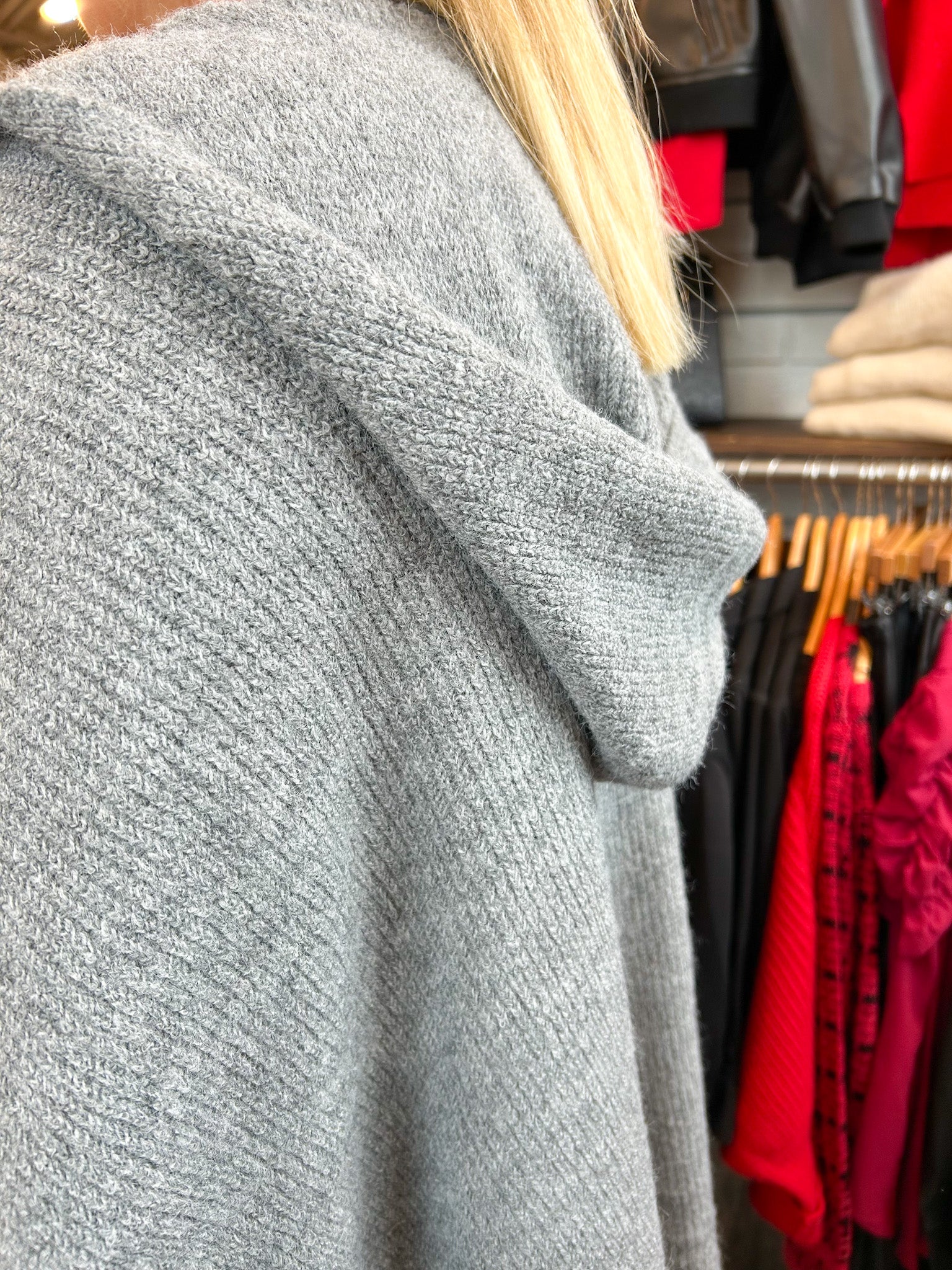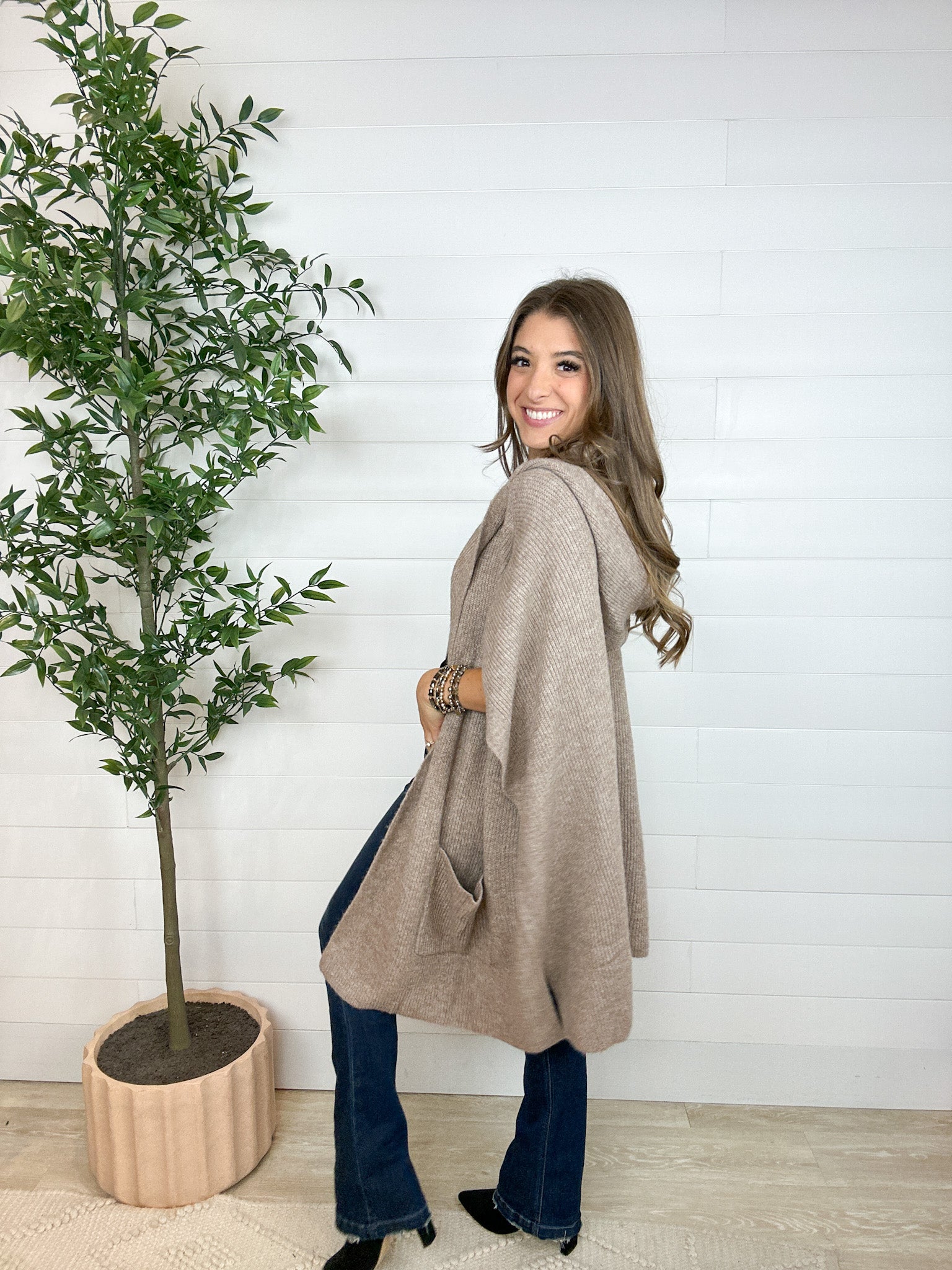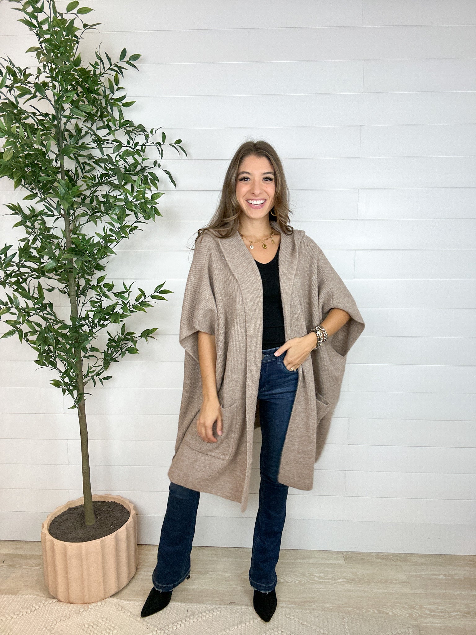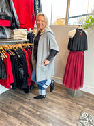 The Hooded Poncho Sweater is your go-to for instant cozy sophistication. Designed as a relaxed poncho-cardigan hybrid, it drapes beautifully for that effortless “I just threw this on” kind of polish. With a roomy hood, open flyaway front, and two top-entry pockets, this piece is as functional as it is fabulous — perfect for layering over everything from tees to turtlenecks.