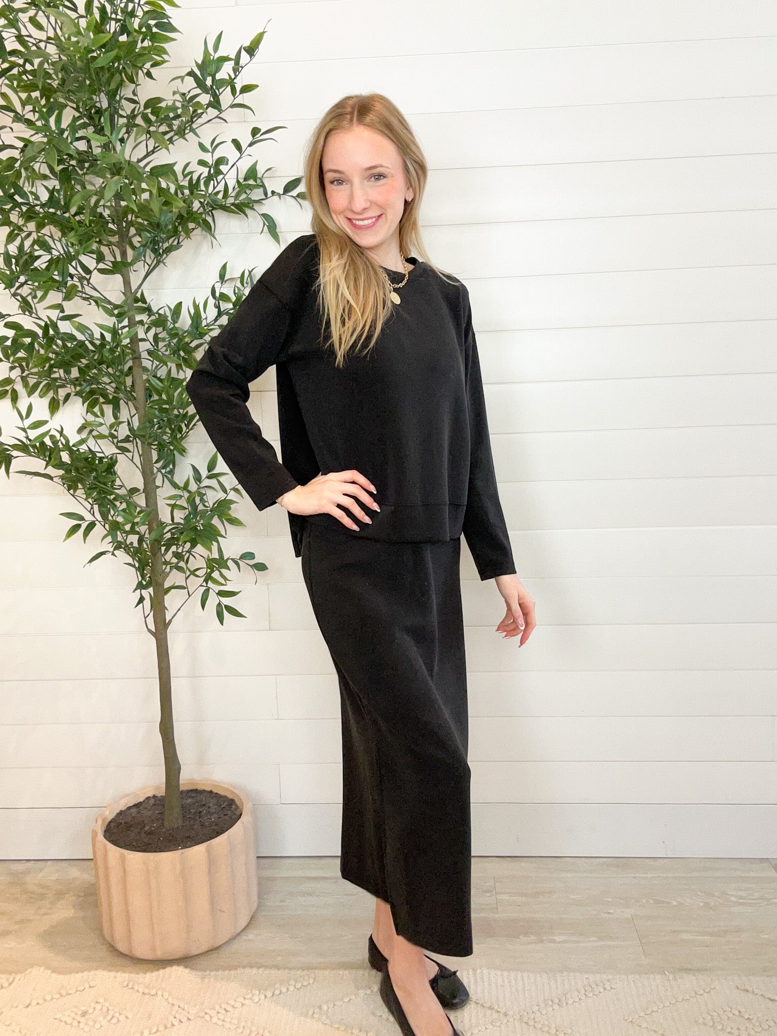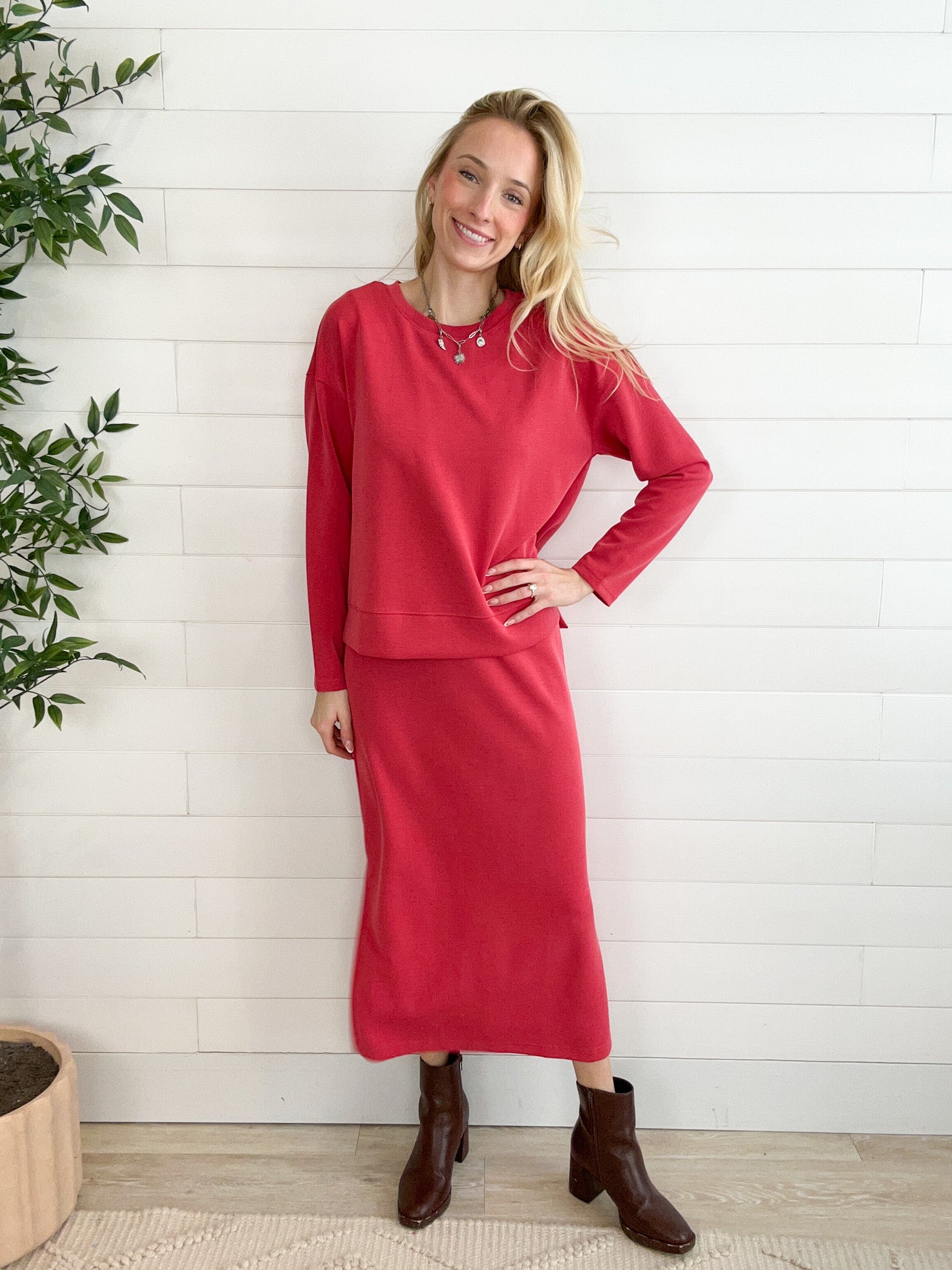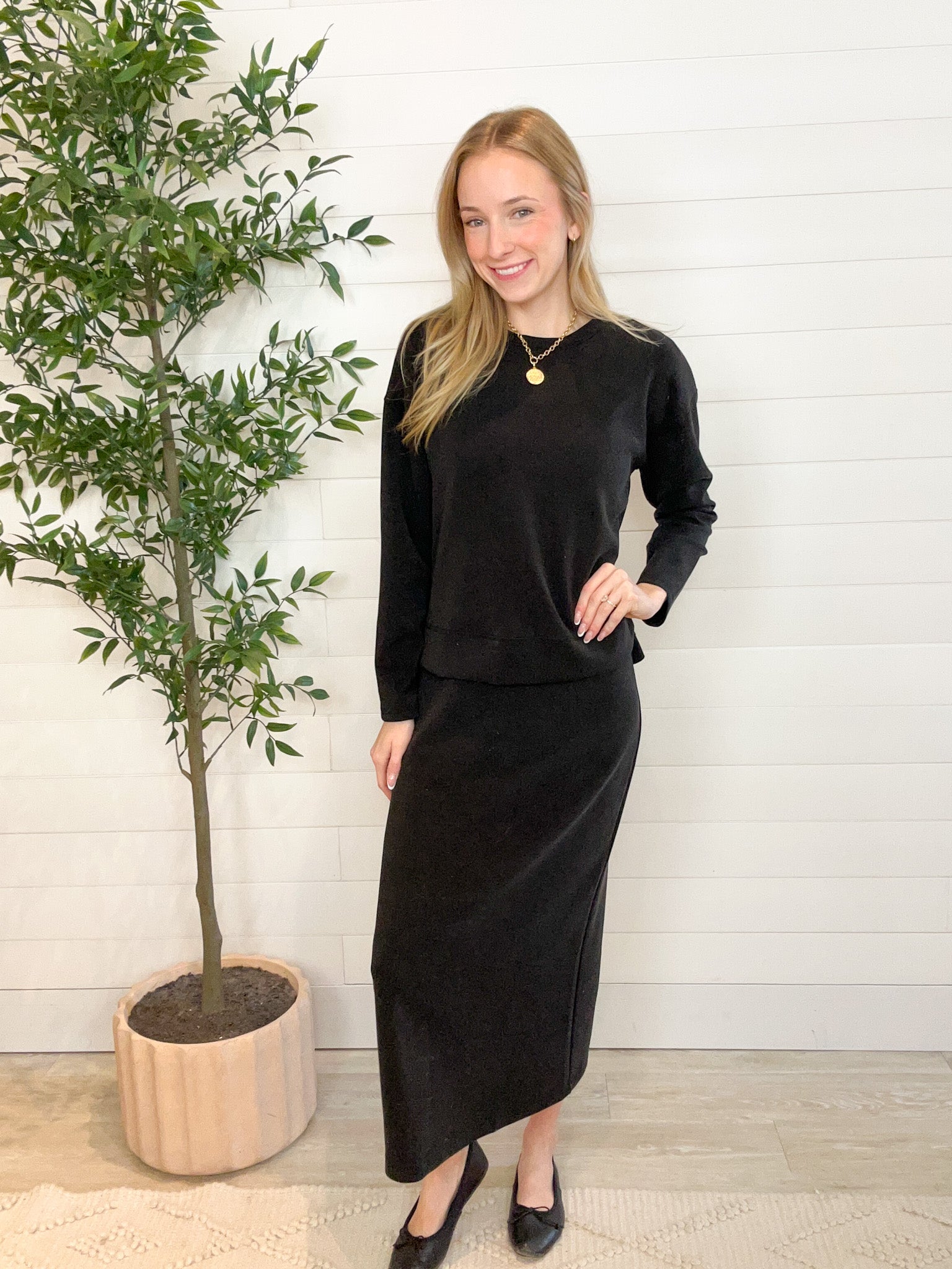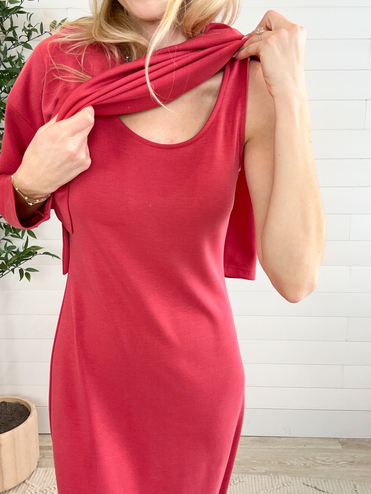 The Tank Dress & Long Sleeve Top Set is the definition of effortless versatility. This ultra-soft two-piece combo features a relaxed-fit long sleeve top layered over a sleek, sleeveless tank dress for a modern, laid-back look. Wear them together for easy styling or mix and match for even more outfit options. The dress includes a side slit for comfortable movement, while the stretchy, buttery fabric keeps everything feeling amazing all day long — perfect for lounging, errands, or casual plans.