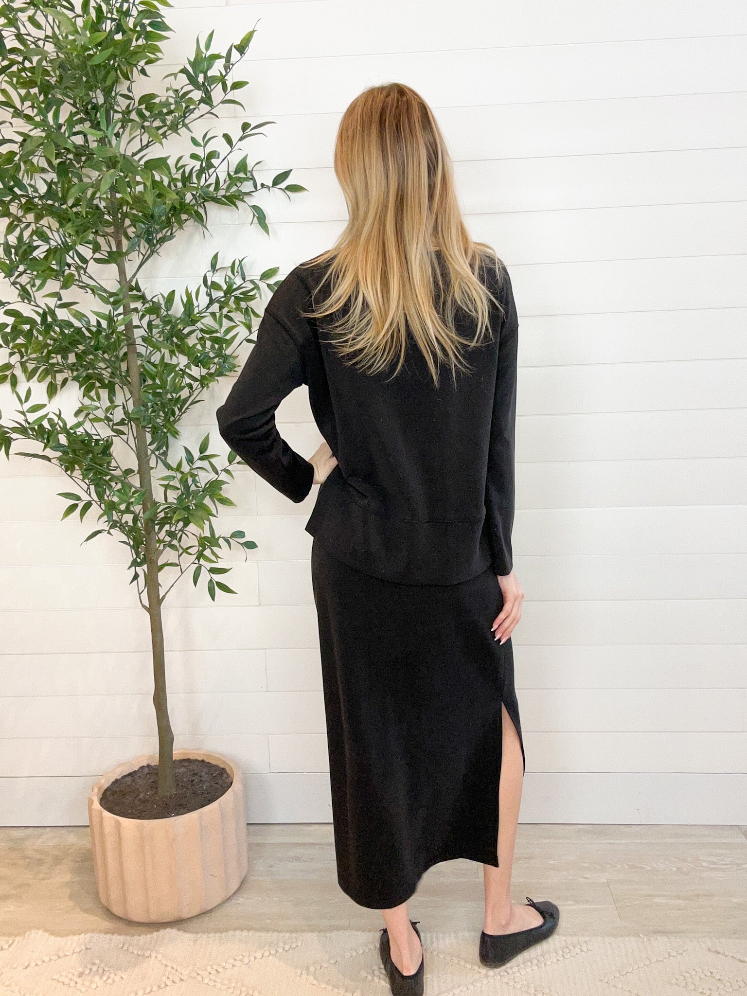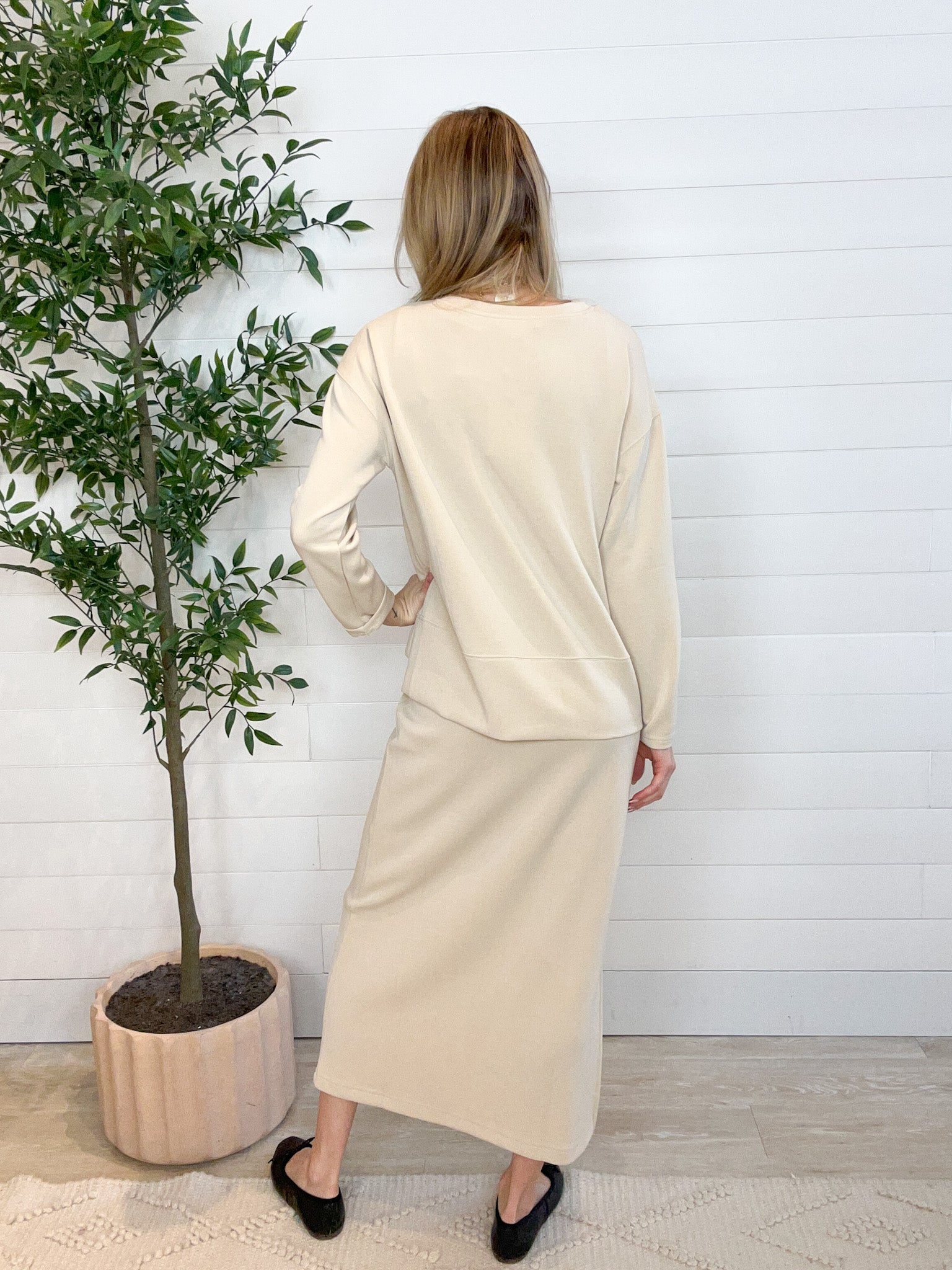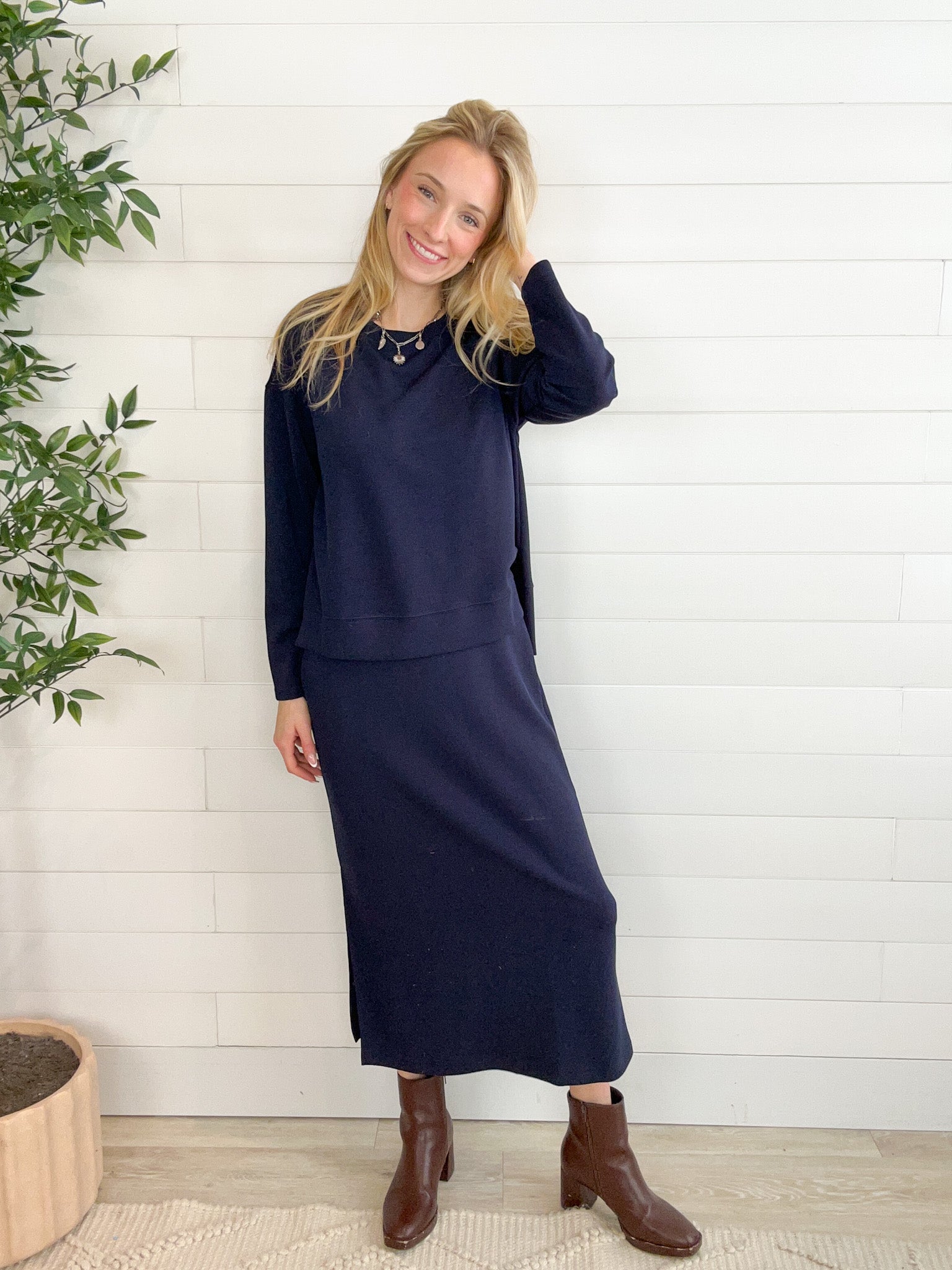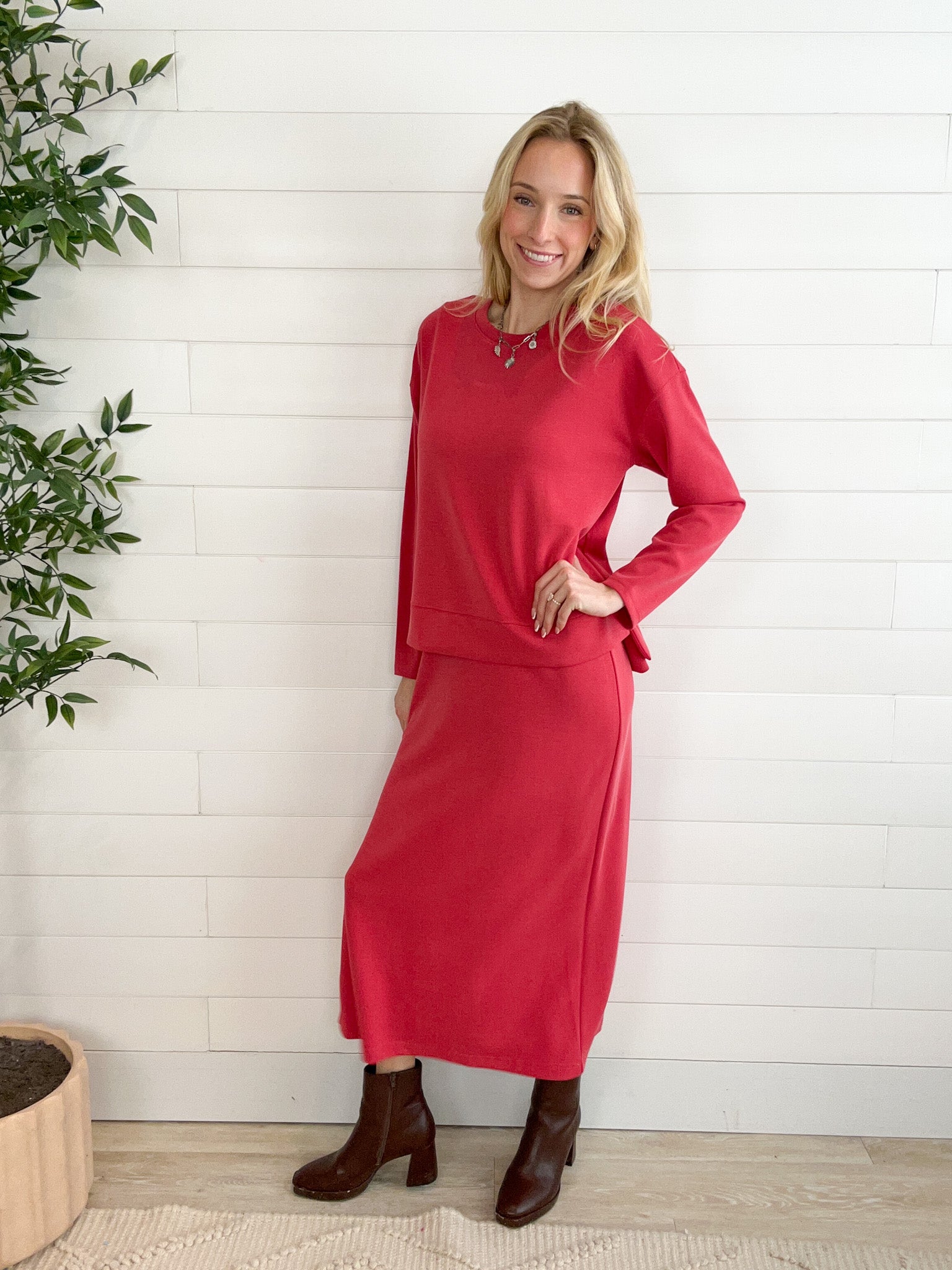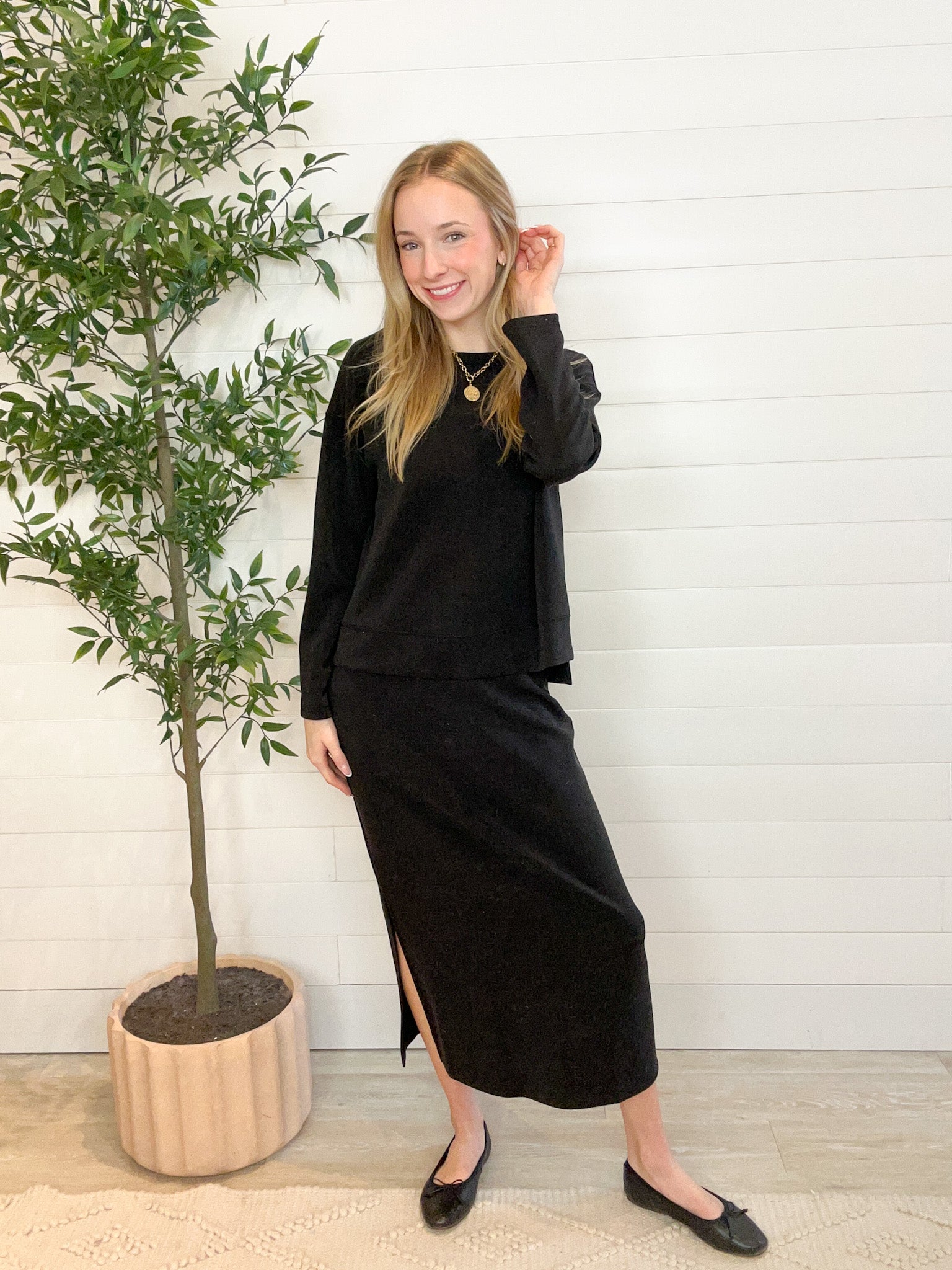 The Tank Dress & Long Sleeve Top Set is the definition of effortless versatility. This ultra-soft two-piece combo features a relaxed-fit long sleeve top layered over a sleek, sleeveless tank dress for a modern, laid-back look. Wear them together for easy styling or mix and match for even more outfit options. The dress includes a side slit for comfortable movement, while the stretchy, buttery fabric keeps everything feeling amazing all day long — perfect for lounging, errands, or casual plans.