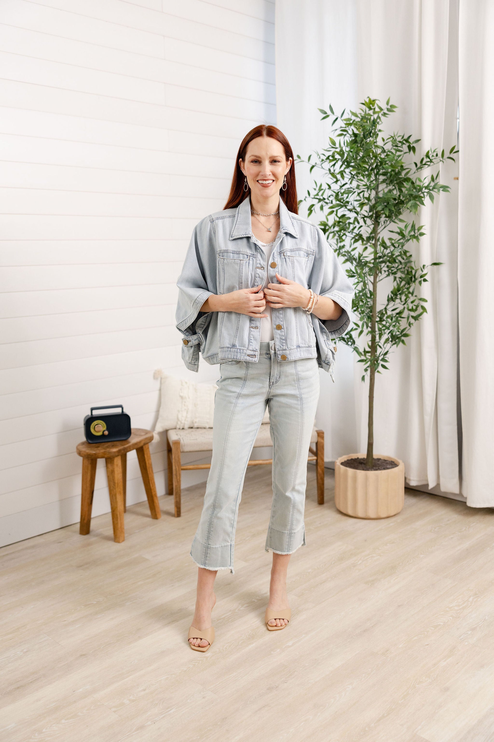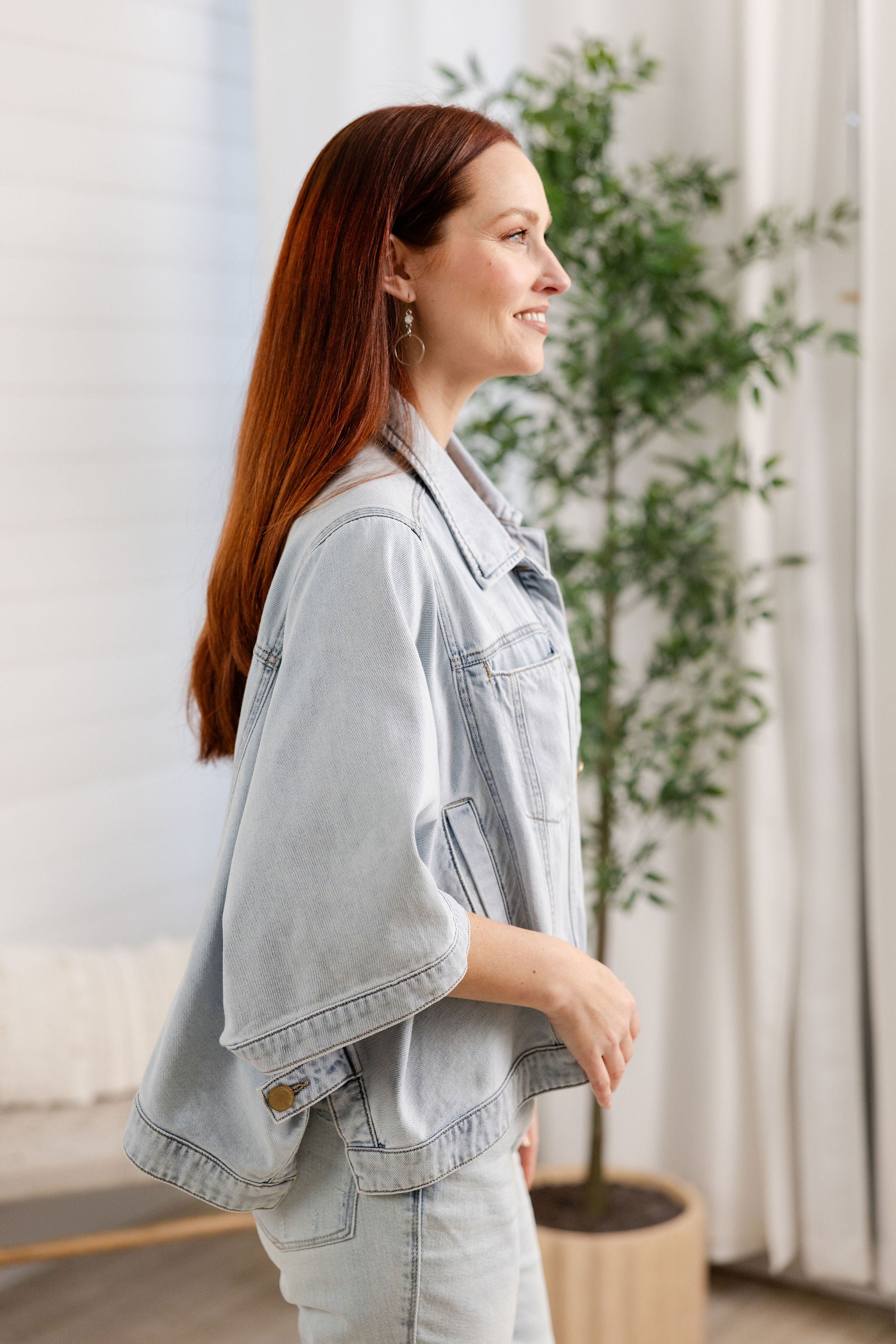 Modern layering meets effortless edge in this light wash denim caplet. Designed with a classic collar and button-down front, this structured yet relaxed silhouette offers a fresh take on a traditional denim jacket.