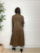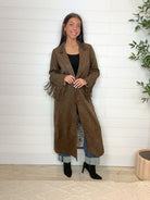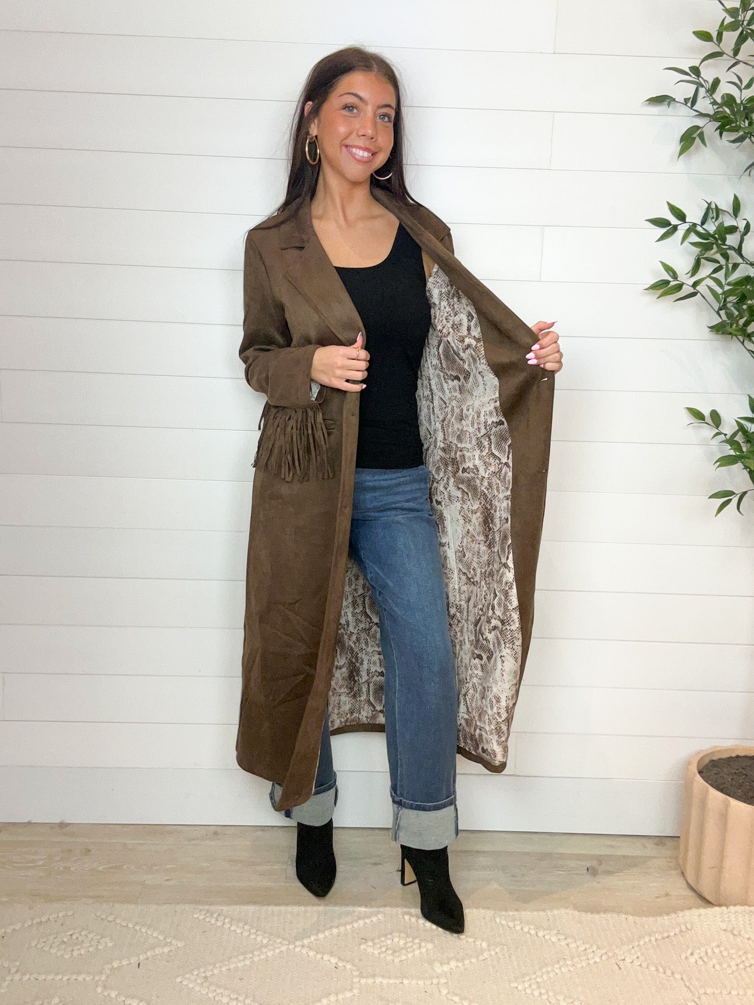 Turn heads this season with the Fringe Trim Faux Suede Coat—a statement layer that blends western flair with polished tailoring. Crafted in soft faux suede with a touch of stretch, this coat features a classic blazer-inspired silhouette with a notch lapel, button-front closure, and sleek top-entry pockets. The real star? Swingy fringe detailing that cascades down the arms and across the back, bringing plenty of movement (and compliments) wherever you go. Fully lined for comfort and warmth, it’s the perfect mix of fun and functional.