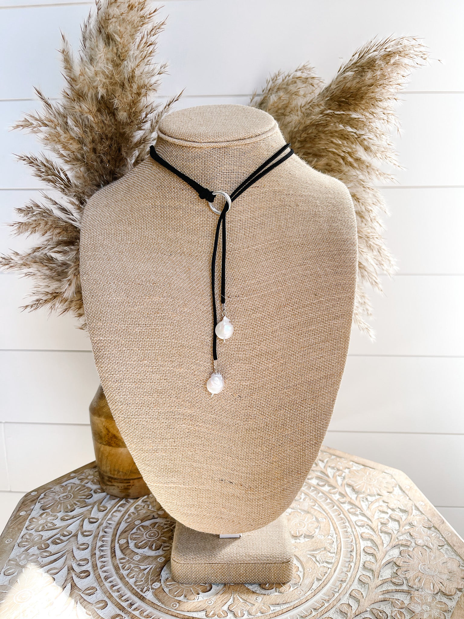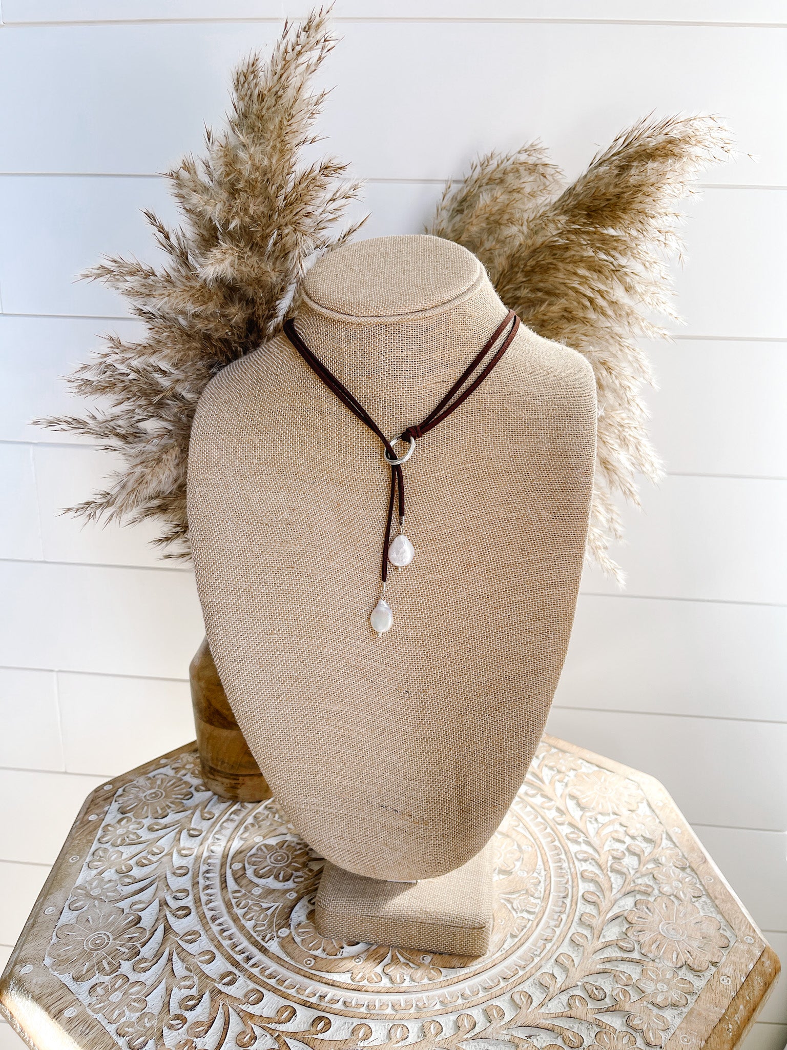 Mac and Me Double Strand Soft Suede Leather Lariat W/ Silver Brass Hoop & Fresh Water Pearls