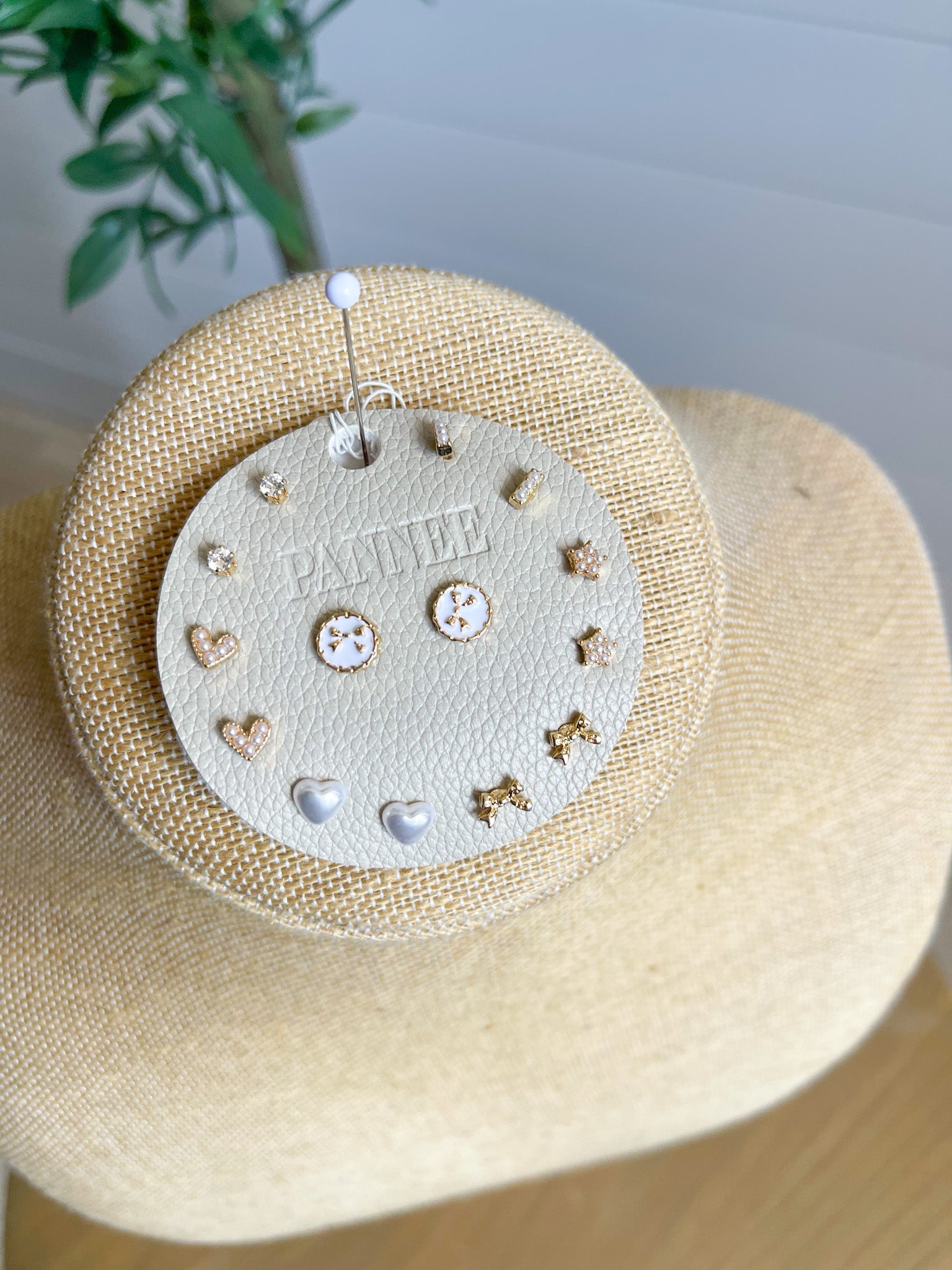 The Pearl & Bow Set includes seven dainty pairs of stud earrings—each one sweeter than the last. From classic pearls to twinkling rhinestones, tiny hearts, and delicate bows, this curated collection is perfect for mixing and matching every day. Safe for sensitive ears and endlessly versatile.
