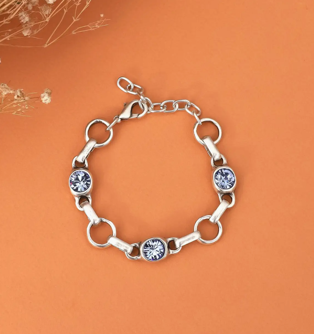 This antique silver bracelet features light blue crystal glass stones and a bohemian-inspired chain design for just the right mix of shimmer and soul. The adjustable lobster clasp ensures a perfect fit, whether you’re dressing up for a festive night or adding a unique accent to your everyday look. Handcrafted with hypoallergenic materials and made to shine.