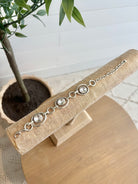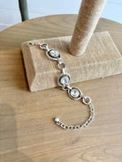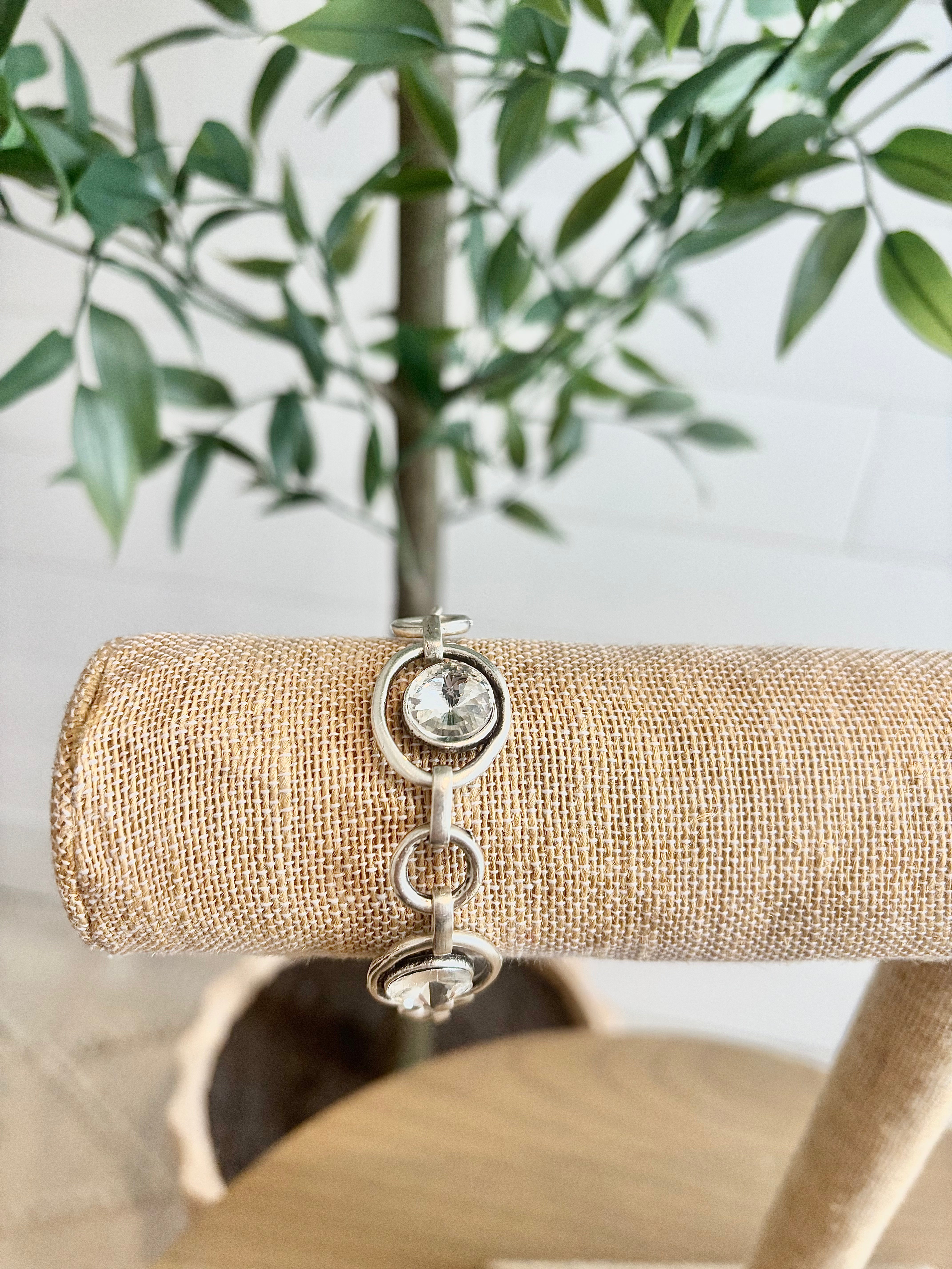 This antique silver bracelet blends edgy style with delicate detail—white crystal stones are nestled into the sides of each chain link, catching the light with every movement. The toggle closure adds a timeless finish to this beautifully handcrafted piece, perfect for stacking or shining solo.