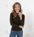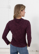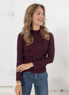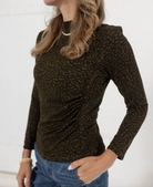 Sleek and easy to style, this knit top is an eye-catching must-have. It features long sleeves, a mock neck, asymmetrical side ruching details, and a subtle animal print.
