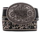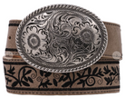Make a statement with this bold western-inspired belt. Crafted from floral-embossed faux leather and finished with intricate bird-and-branch embroidery, it’s topped off with a large vintage-style metal buckle for that perfect blend of rugged charm and feminine flair. An easy way to add personality to denim, dresses, or flowy skirts.