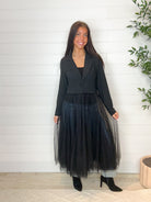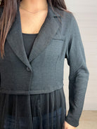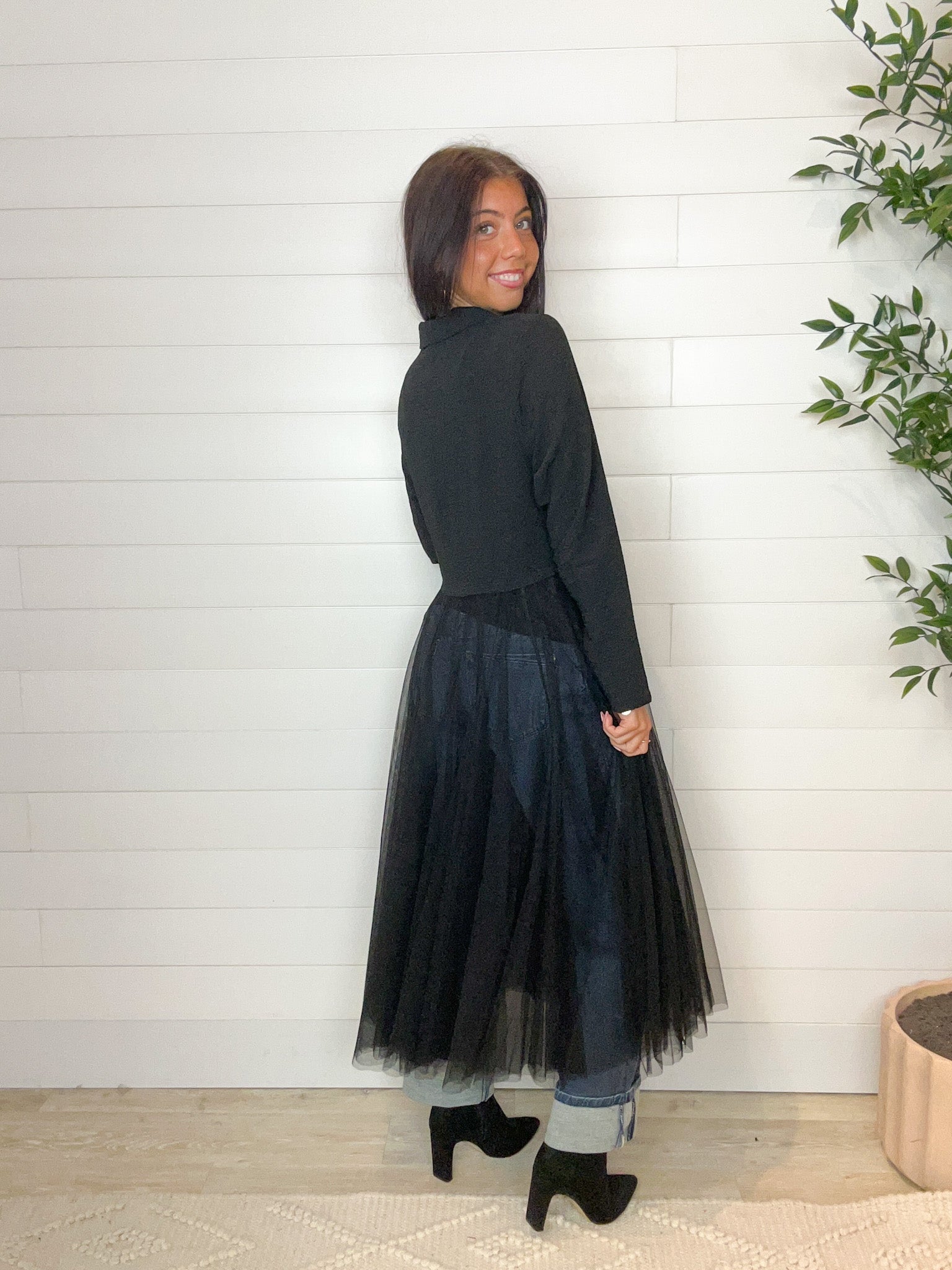 The Cardigan Blazer w/ Tulle Duster takes two favorites and fuses them into one unforgettable piece. Up top, you get the structure of a cropped blazer—sharp, polished, and chic. Flowing from the waist, a sheer tulle duster brings movement, drama, and a dress-like finish. The contrast is striking, the vibe is modern romantic, and the styling possibilities are endless.