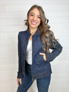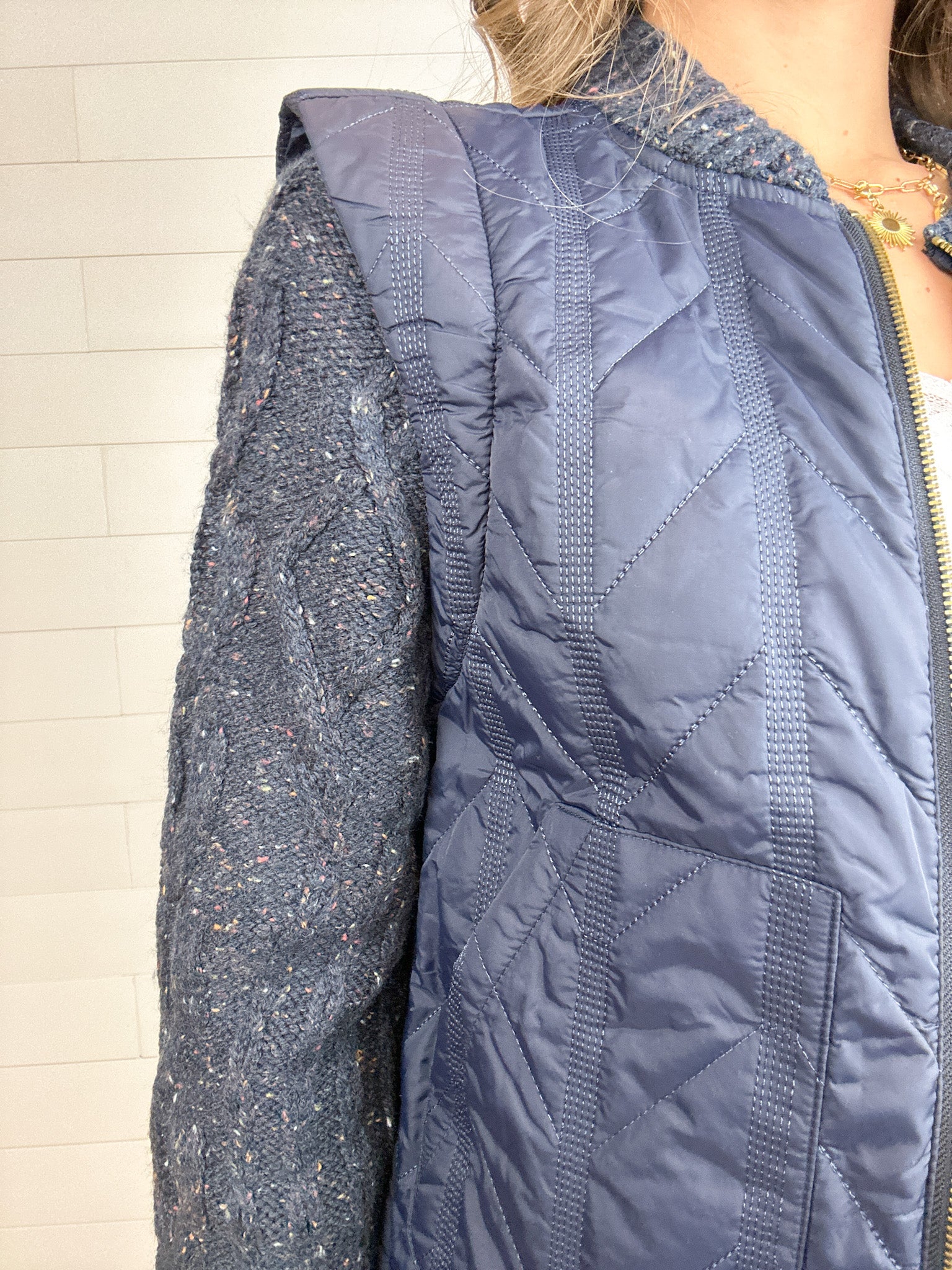 Get into the chic twofer trend with this mixed media jacket that looks like a quilted vest layered over a sweater. It has long sleeves, a stand collar, zip front, and hi-low hem.