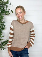 Say hello to the Contrast Hem & Stripe Pullover Sweater — a playful twist on a classic! This soft and lightweight knit features thin stripes across the body and bold, thicker stripes down the sleeves for a fun mix-and-match feel. With its relaxed drop shoulder fit, it’s cozy, casual, and totally cute for everyday wear.