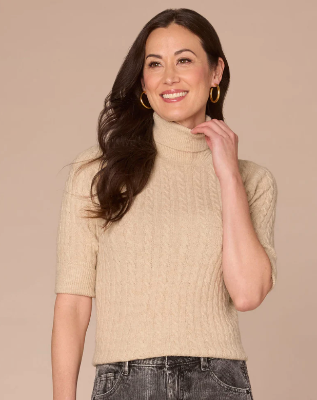 This modern take on the timeless turtle neck sweater is flattering, feminine, and extremely versatile. It has elbow-length cuff sleeves, a cable stitch mix design, and a straight hem.