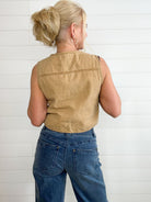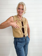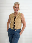- Garment-Dyed Denim: Softly structured cotton denim with a vintage wash finish - Adjustable Tie Front: Three self-tie closures offer flexible fit and styling options - Cropped Silhouette: Hits at the waist with subtle shaping for a flattering layer - Patch Front Pockets: Functional square pockets add utility and charm - Sleeveless Design: Perfect for layering over tees, dresses, or blouses
