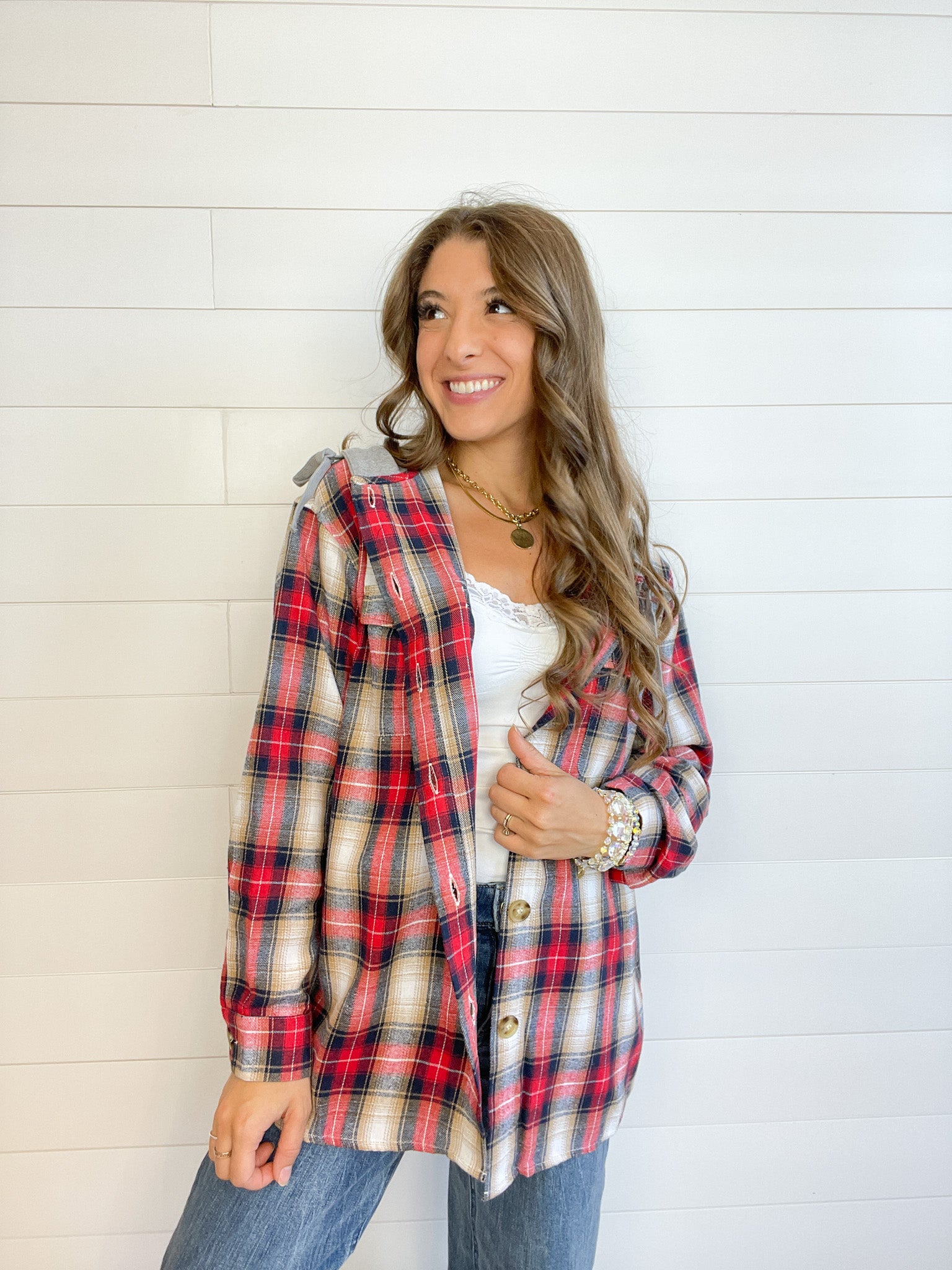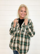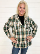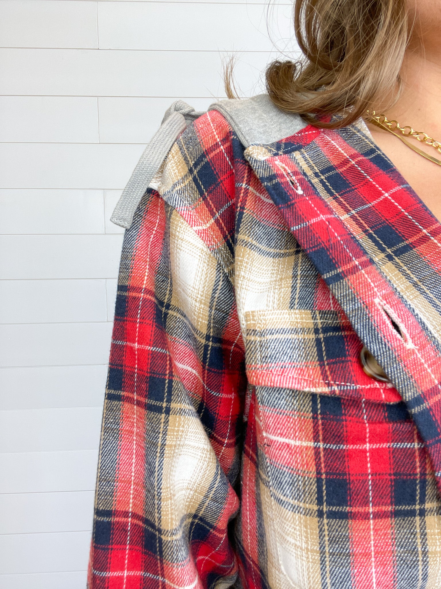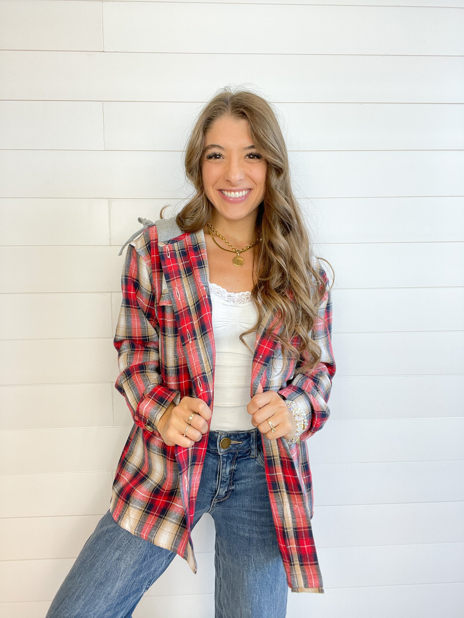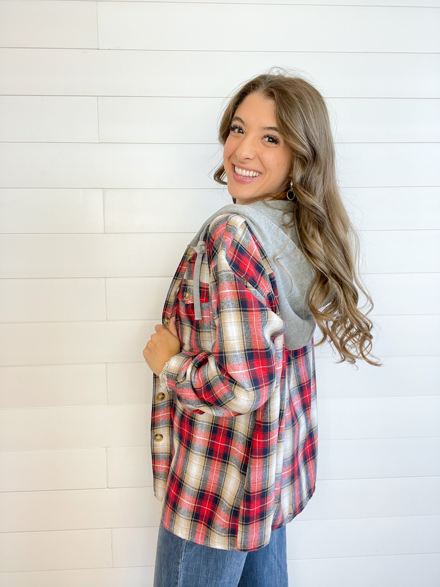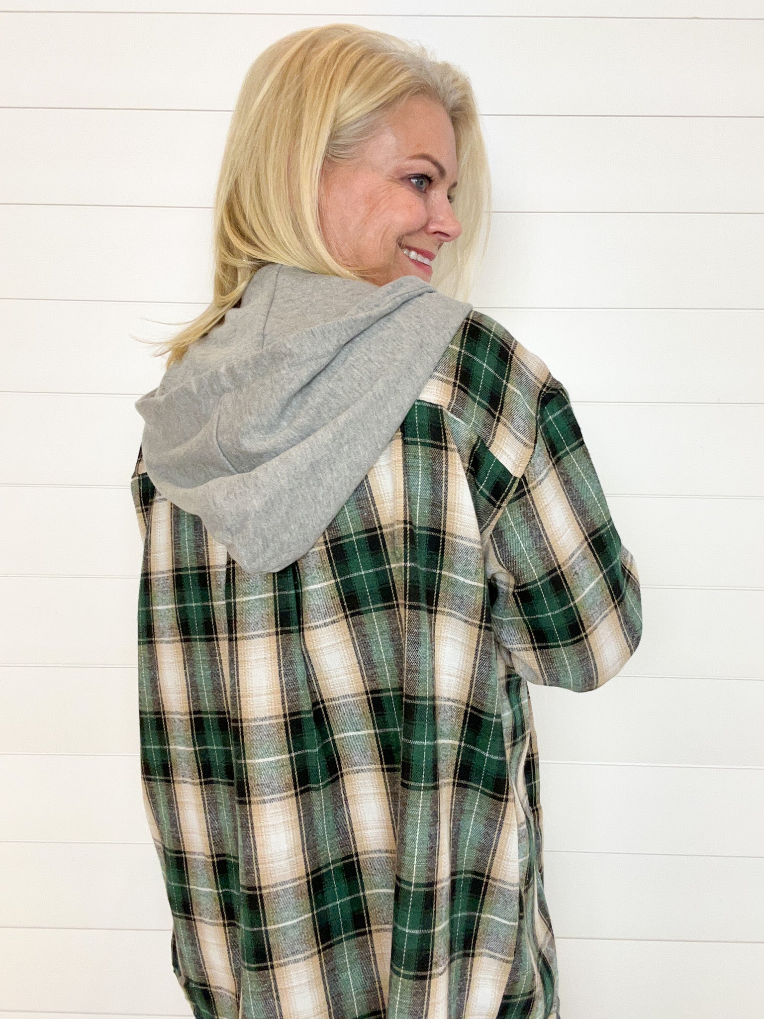 This Hooded Plaid Shirt Jacket is the ultimate casual layering piece. Designed with an oversized fit and a cozy built-in hood, it's perfect for transitional days or nights by the fire. The classic plaid pattern and visible button front bring just the right amount of structure to this easygoing piece.