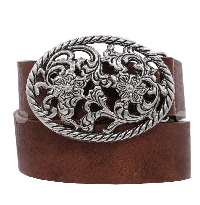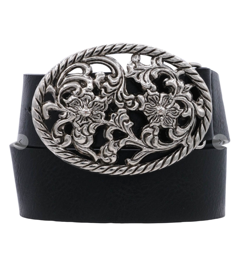 Faux leather floral filigree oval buckle belt Length: 39" Buckle Length: 3 1/2" Buckle Width: 2 5/8"