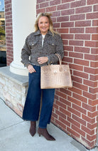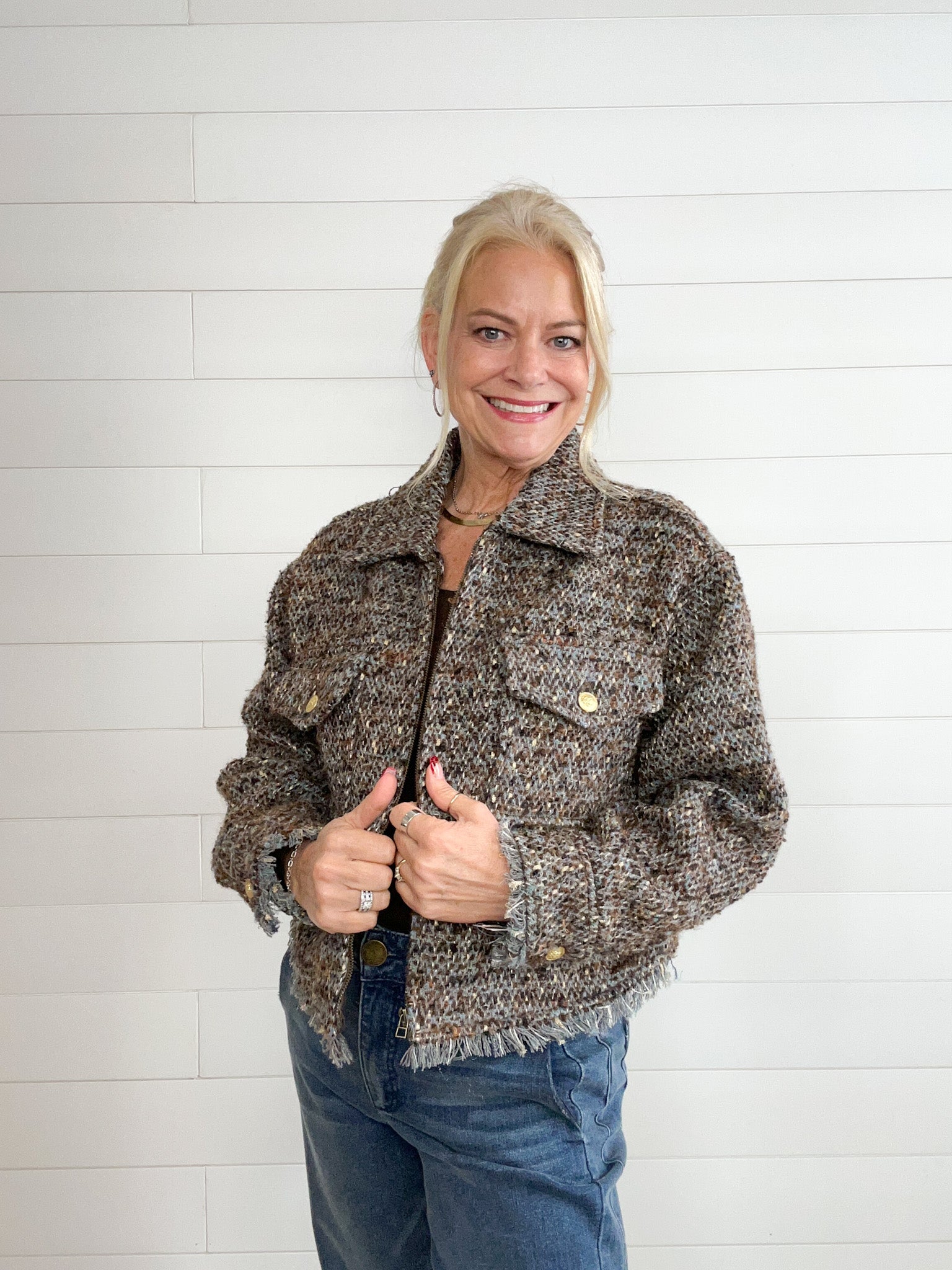 Finally, a jacket that goes with everything. This cropped woven style has long sleeves, a collared neck, zip front, patch pockets, and a fray hem, perfect for dressing up or down.