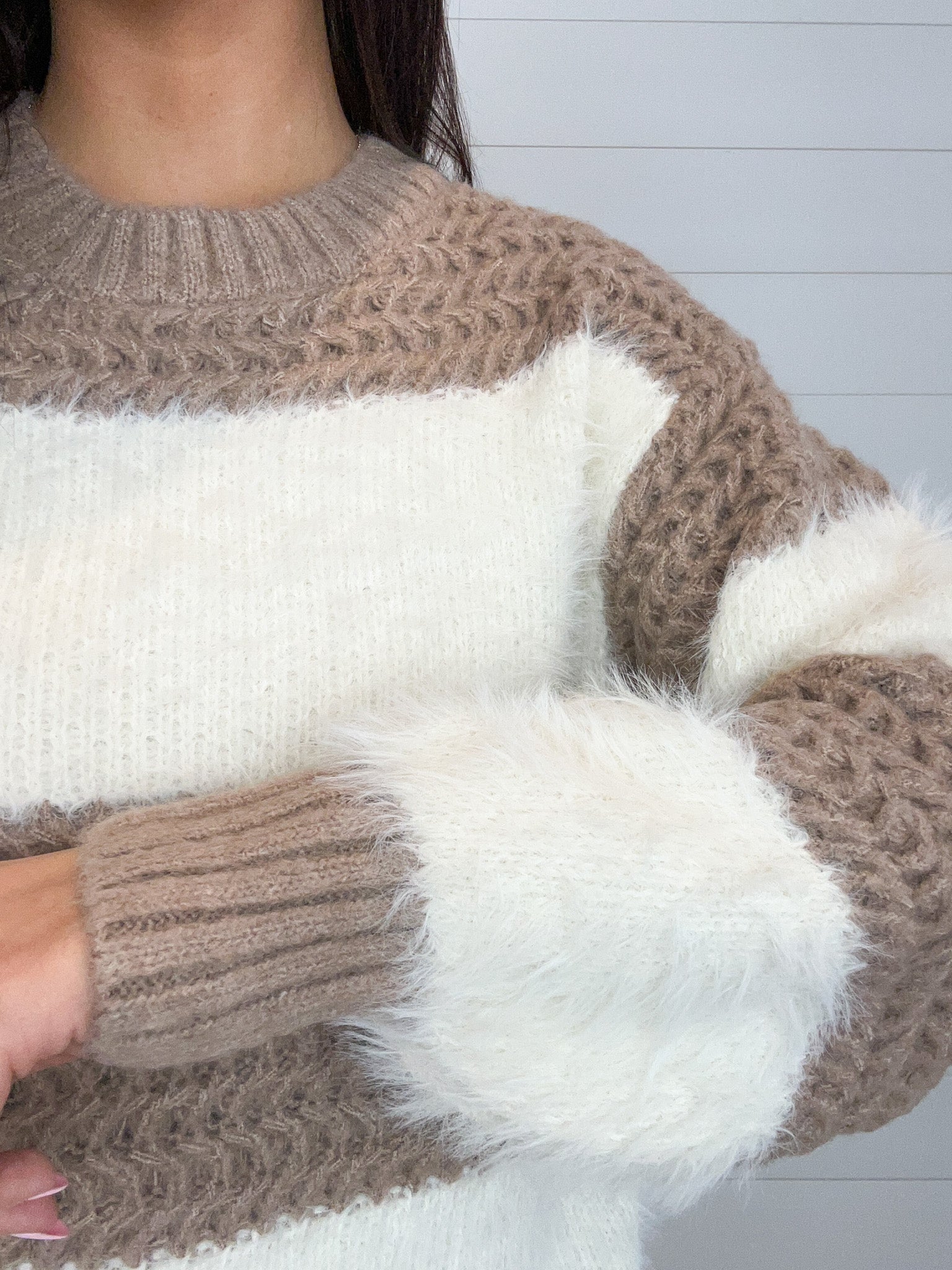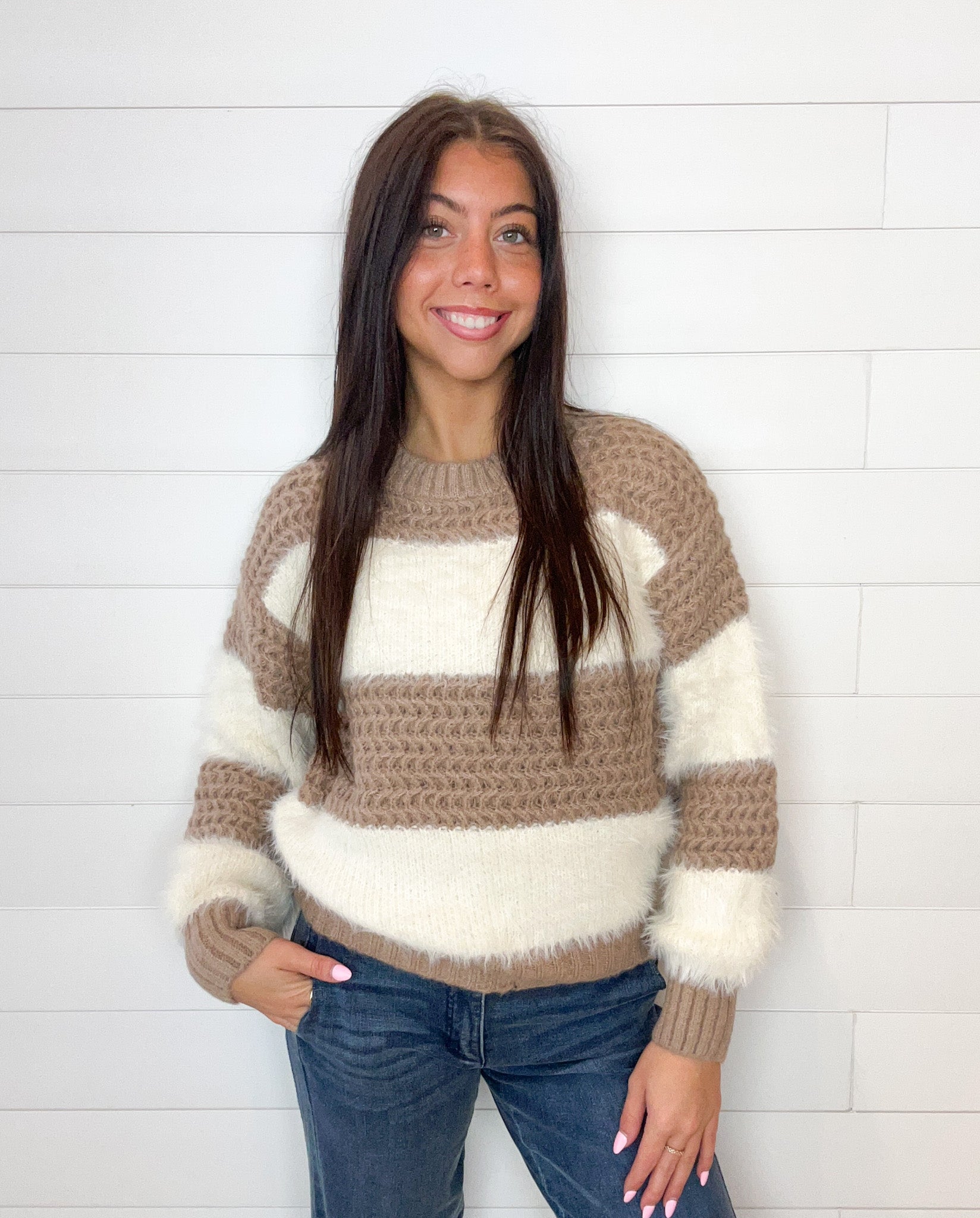 The Fuzzy Mixed Media Striped Sweater is proof that cozy can still be chic. Designed with alternating stripes of textured knit and fuzzy eyelash yarn, it adds just the right amount of depth and dimension to your cold-weather lineup. The crew neckline keeps it classic, while the neutral palette makes it an easy match for just about anything in your closet. Incredibly soft and oh-so-cozy, this sweater is one you’ll want to live in all season long.