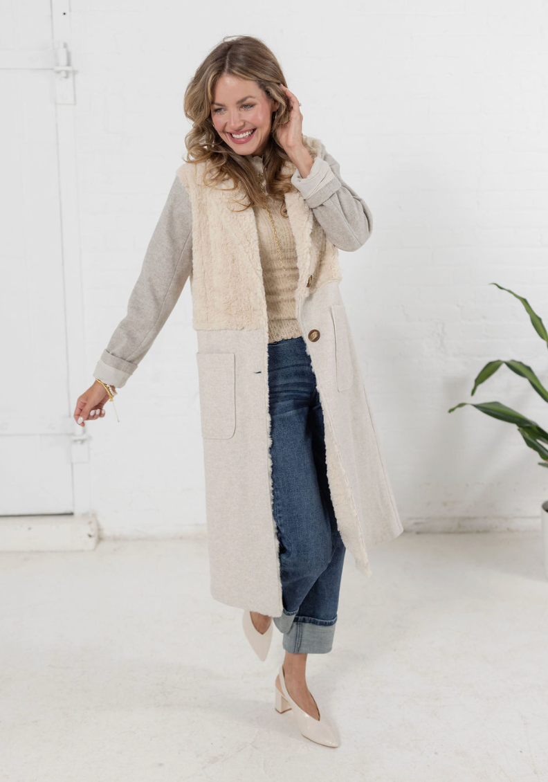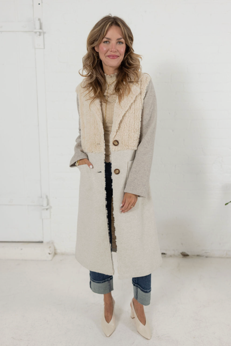 The Half Fur Blocked Duster Coat delivers a luxe layered look in one statement piece. With its plush faux fur top half and sleek, color-blocked lower half, this longline coat brings elegance and warmth together beautifully.
