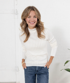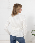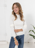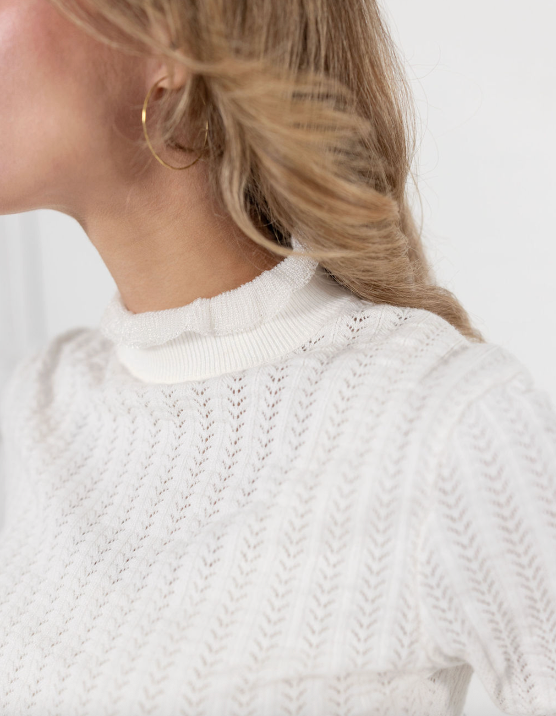Elevate your sweater game with this pointelle style. It’s designed with long sleeves, a mock neck with beaded ruffle edge detailing, and a fit that looks great tucked in.
