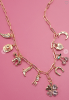 Western-inspired charm necklace, featuring a playful mix of detailed boot, cowboy hat, horseshoe, and heart charms.
