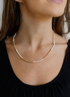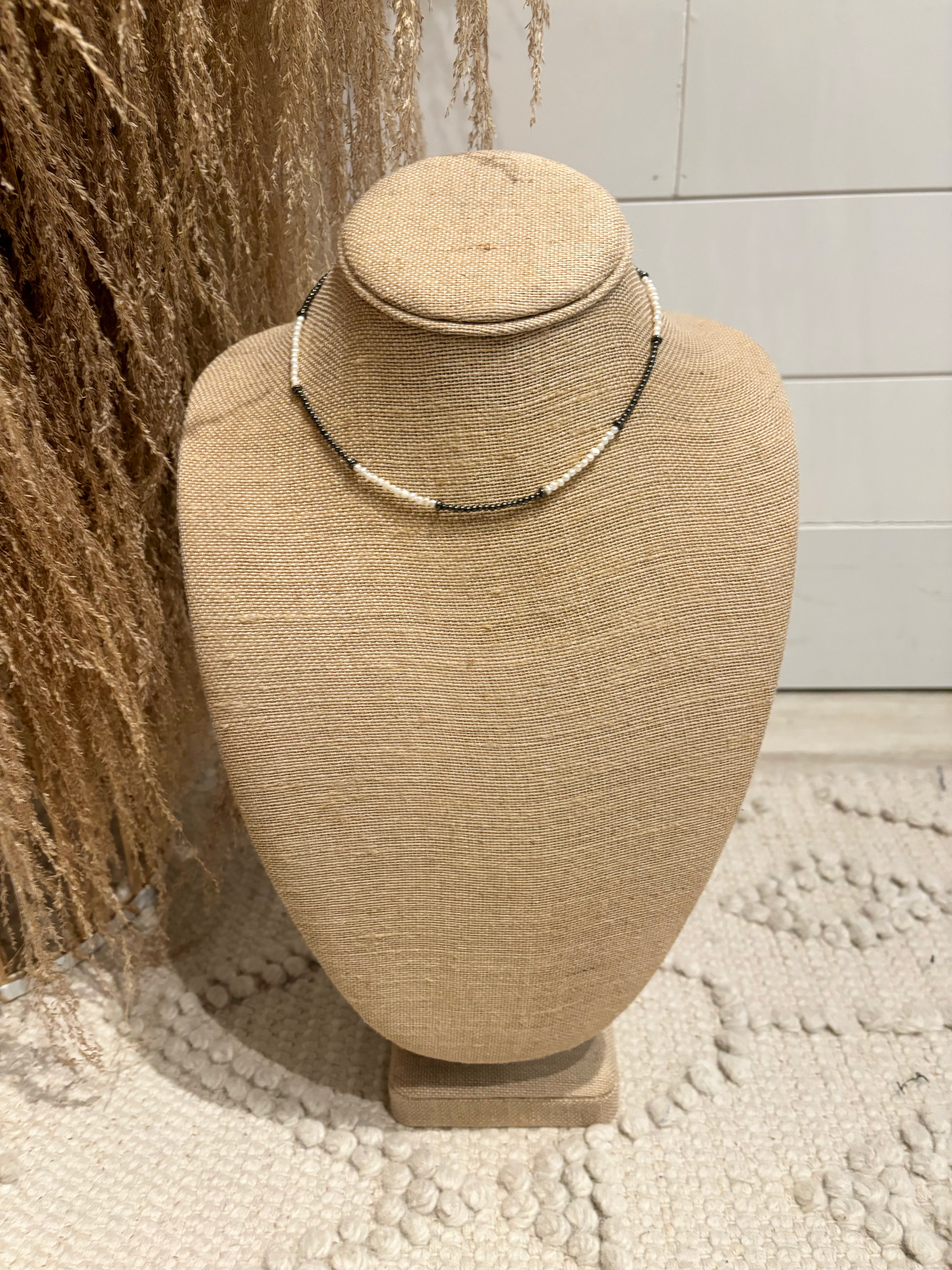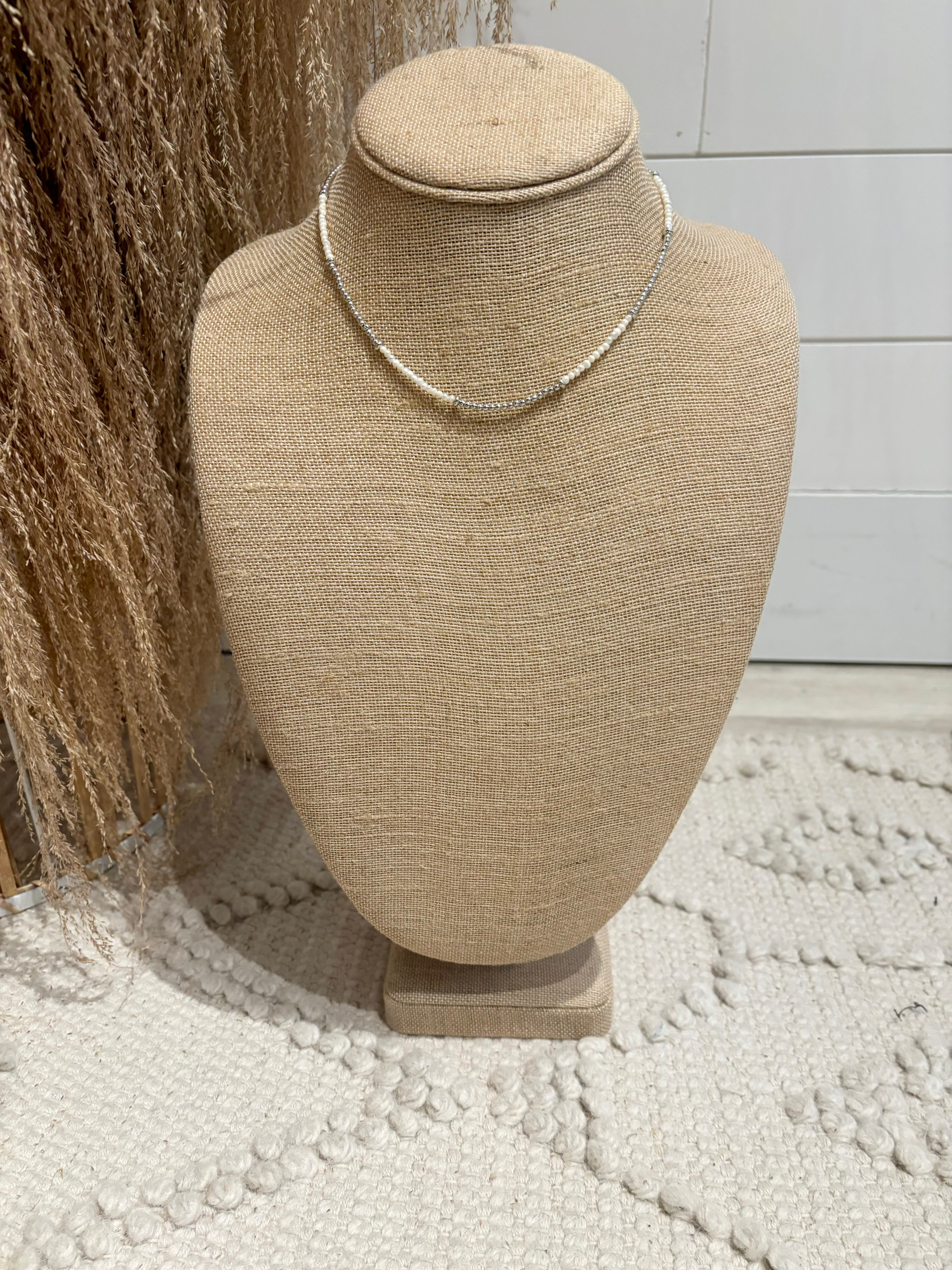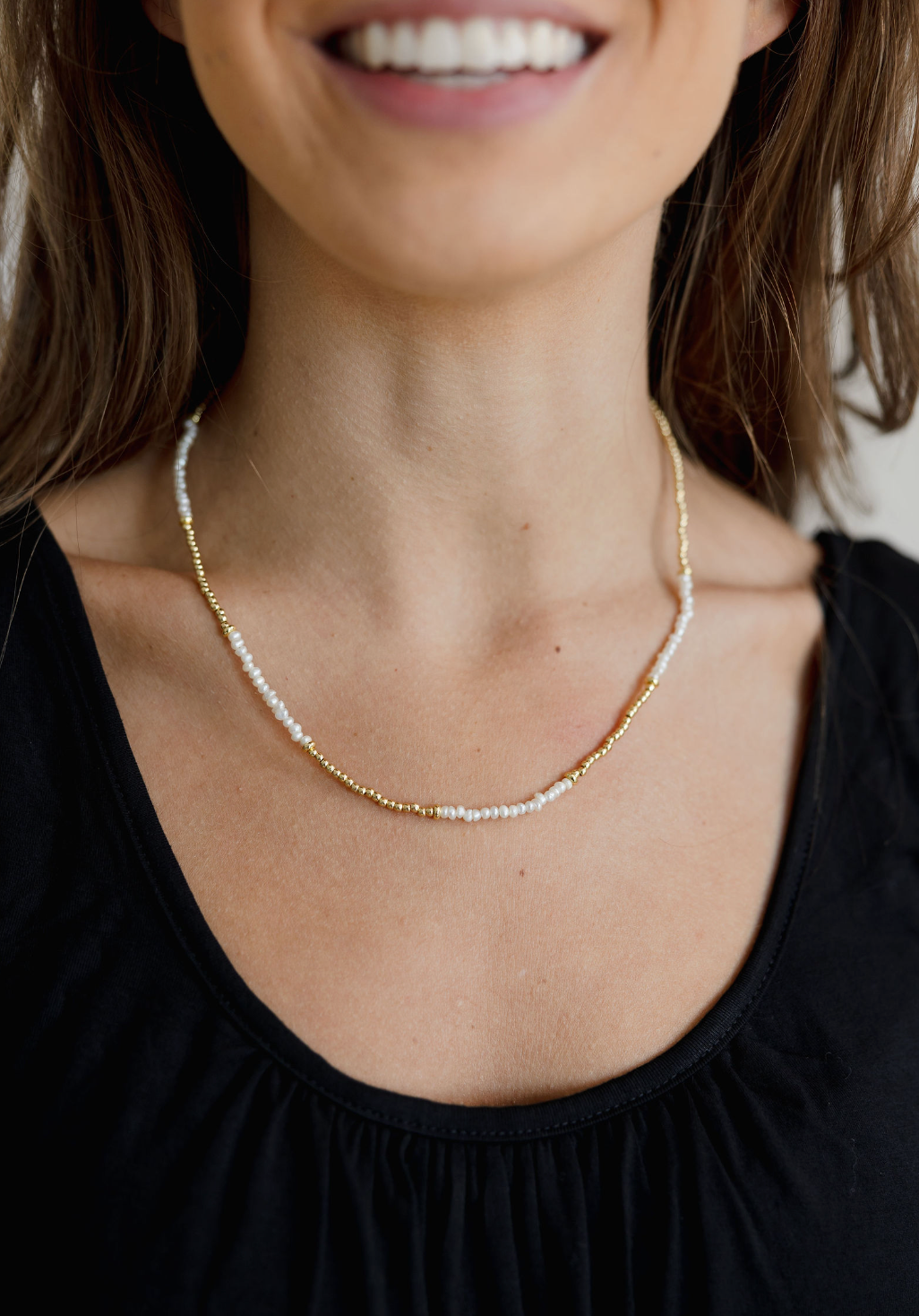 Dainty metallic seed beads and micro freshwater pearls makes this a fresh take on a pearl necklace. Easy to layer or wear alone for a sweet, elegant statement!