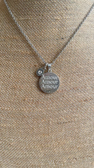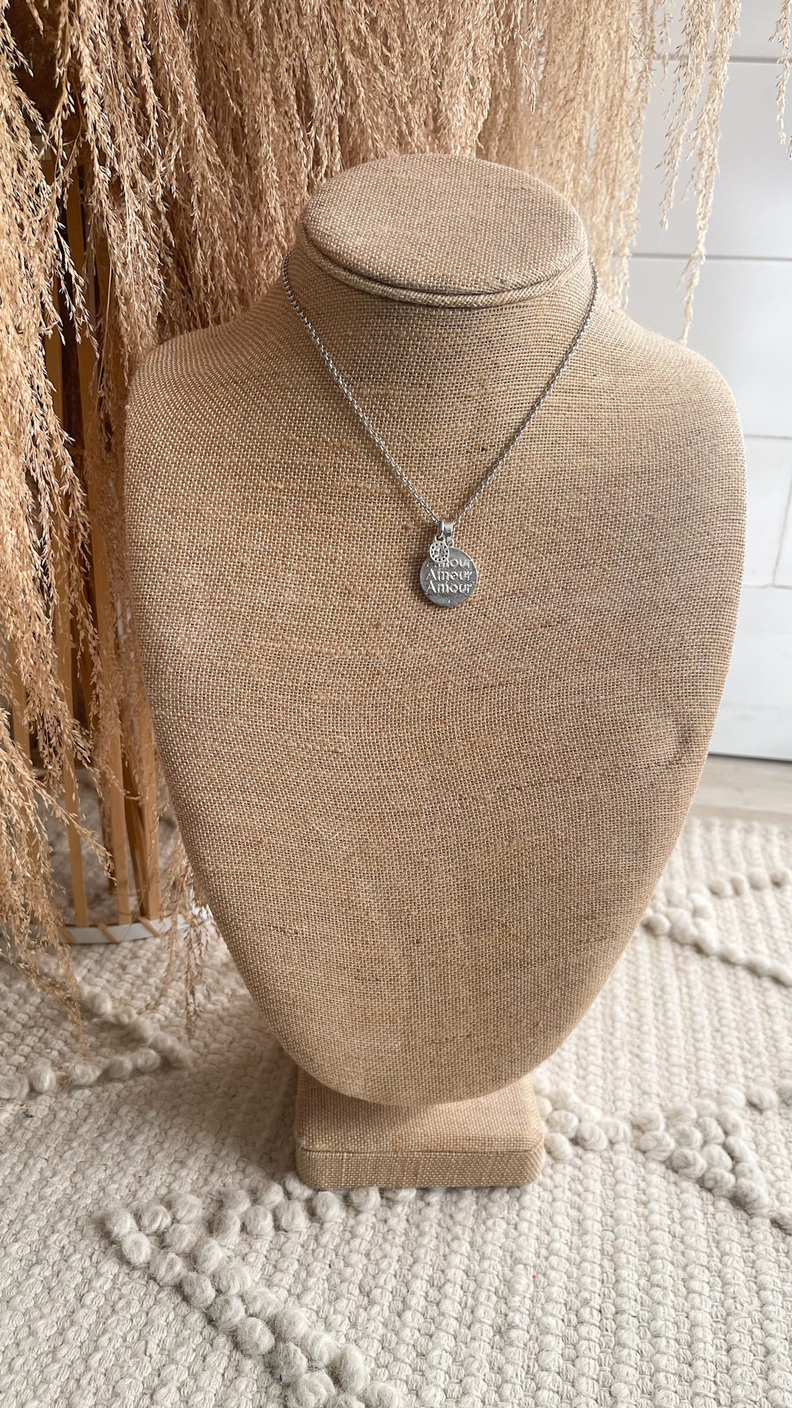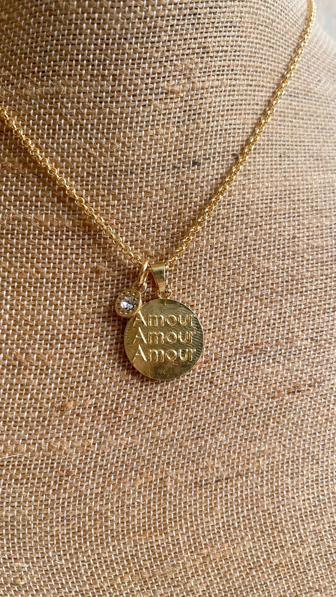 The Mac and Me Dainty Amour Pendant Necklace is a delicate piece featuring a pendant inscribed with "Amour," symbolizing love and affection. Handmade in the USA, this necklace is nickel-free and hypoallergenic, ensuring comfort for sensitive skin. Its minimalist design makes it versatile for both casual and formal wear, and it pairs well with other pieces from the Mac and Me collection. Pieces are plated in either gold or silver.