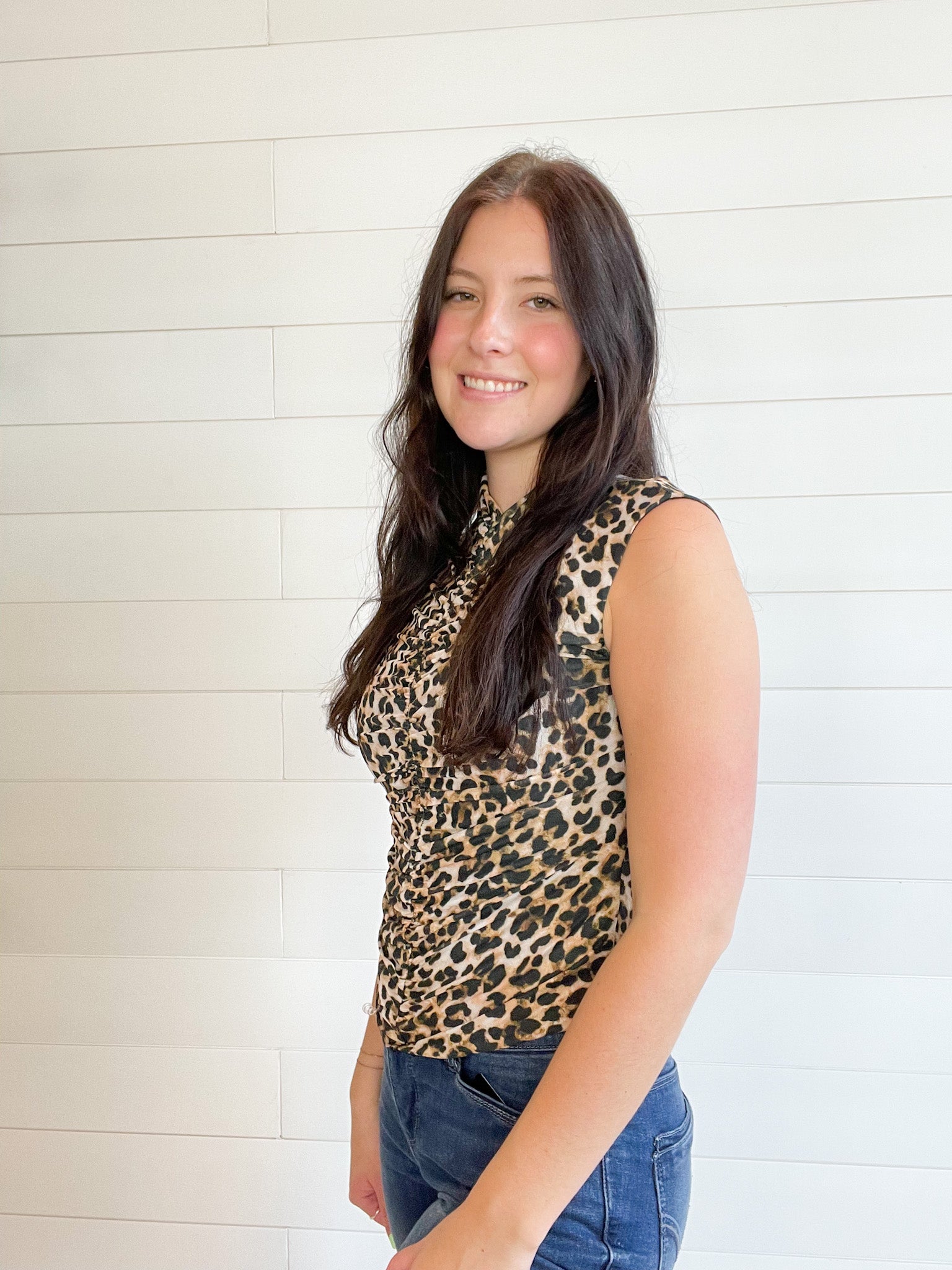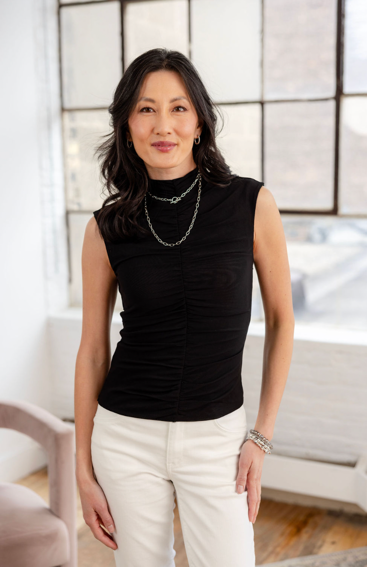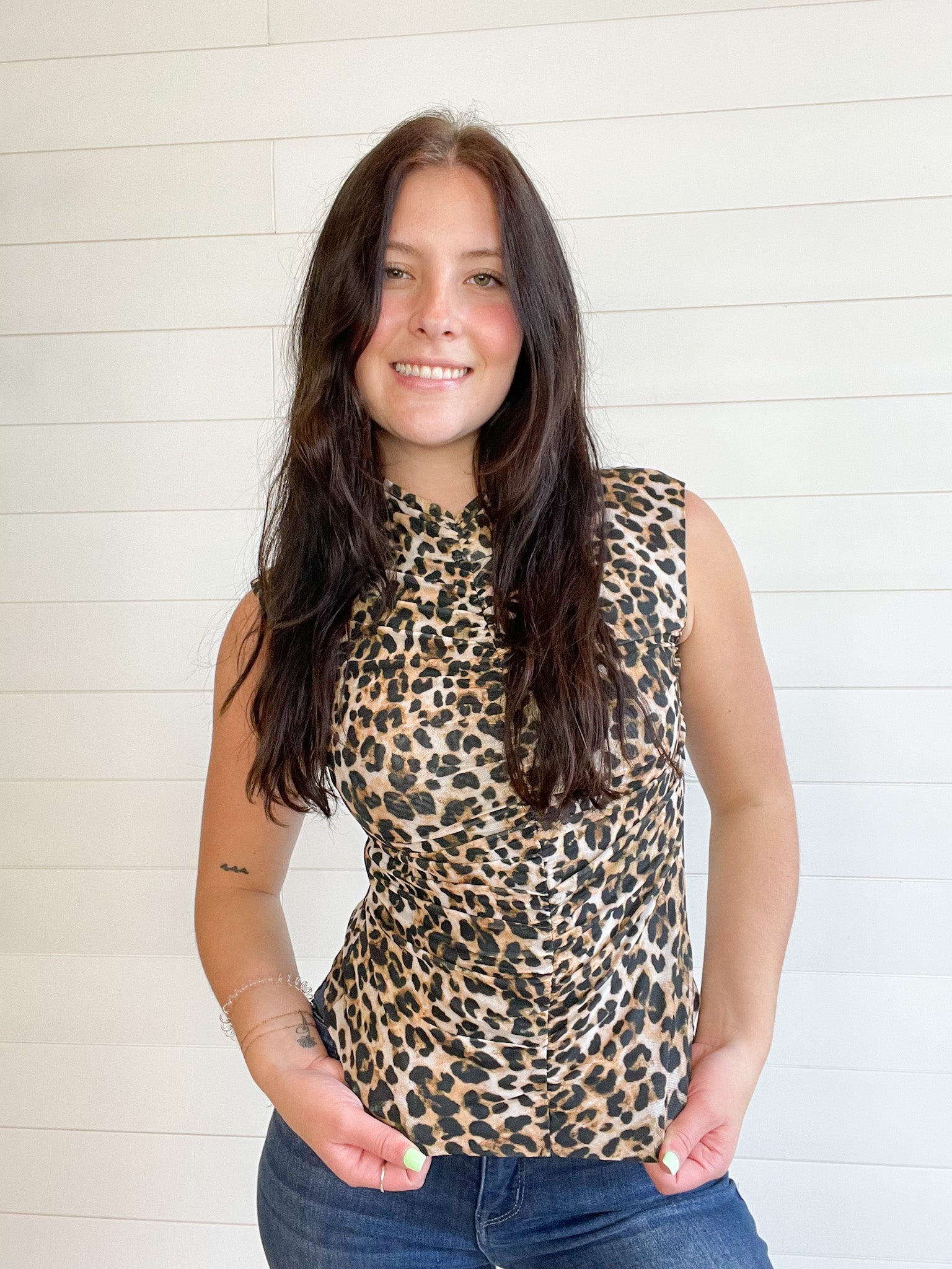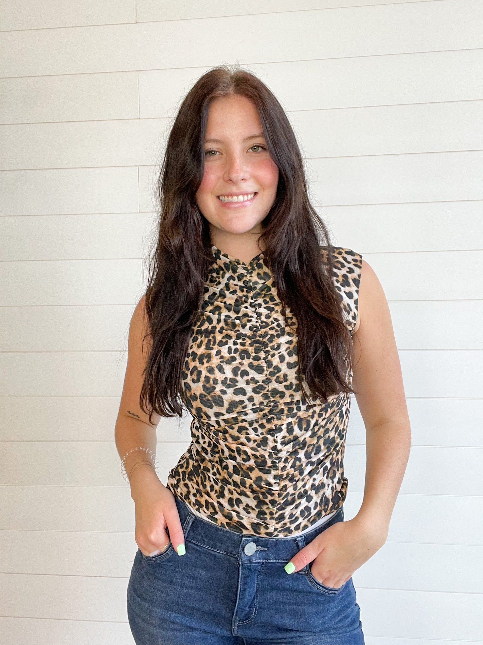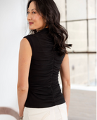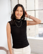 Mac and Me Mesh Sheer Mock Neck Tank offers a modern, edgy look with a delicate sheer finish.