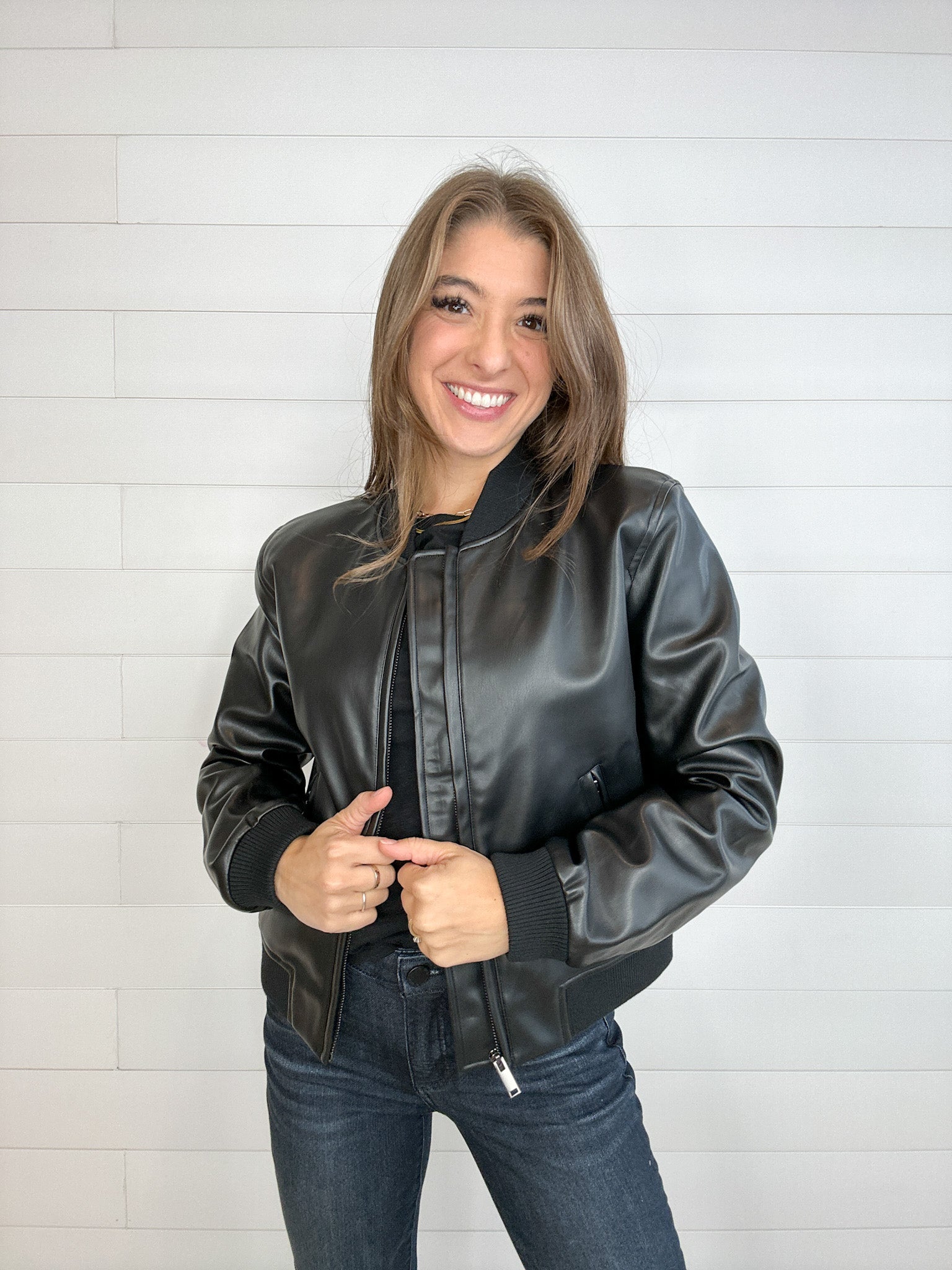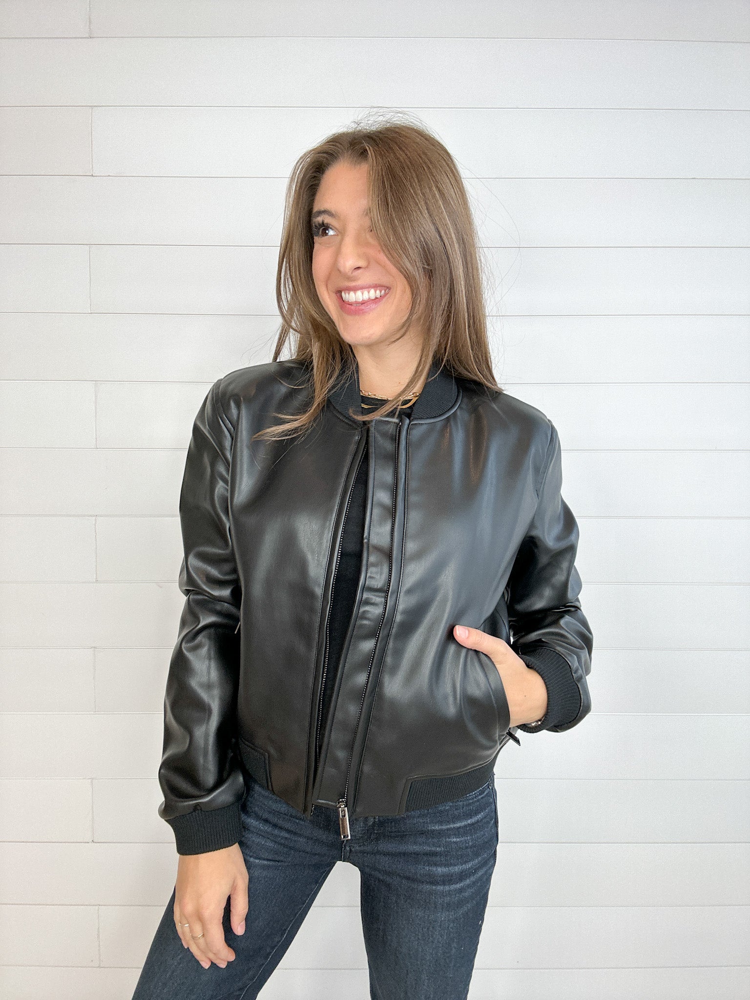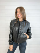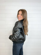 This MB Covered Zipper PU Bomber Jacket brings effortless cool to your wardrobe. Slightly puffy for that cozy-yet-chic vibe, it features sleek covered zipper pockets and a polished silhouette that pairs perfectly with jeans, skirts, or layered dresses.