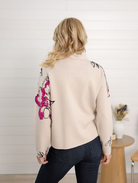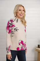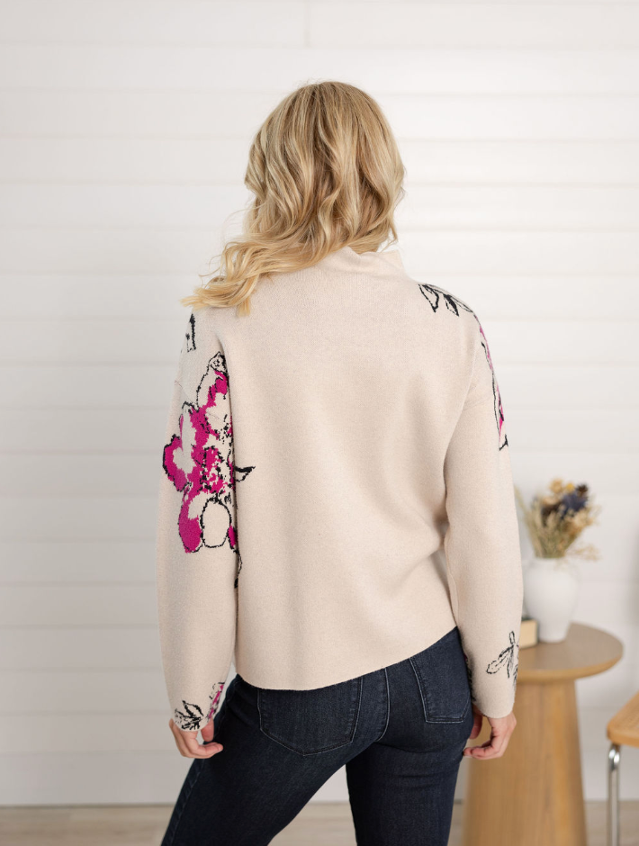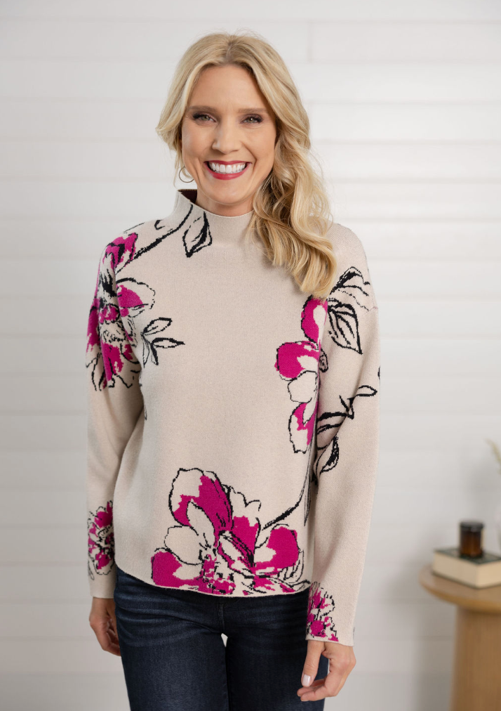 Bring a playful pop of color to your wardrobe with the MB Floral Sketch Funnel Neck Sweater. Featuring hot pink accents on delicate black sketched flowers set against a soft beige background, this sweater blends artistic charm with everyday wearability. The cozy funnel neckline and long sleeves make it perfect for layering or wearing solo for a statement look.