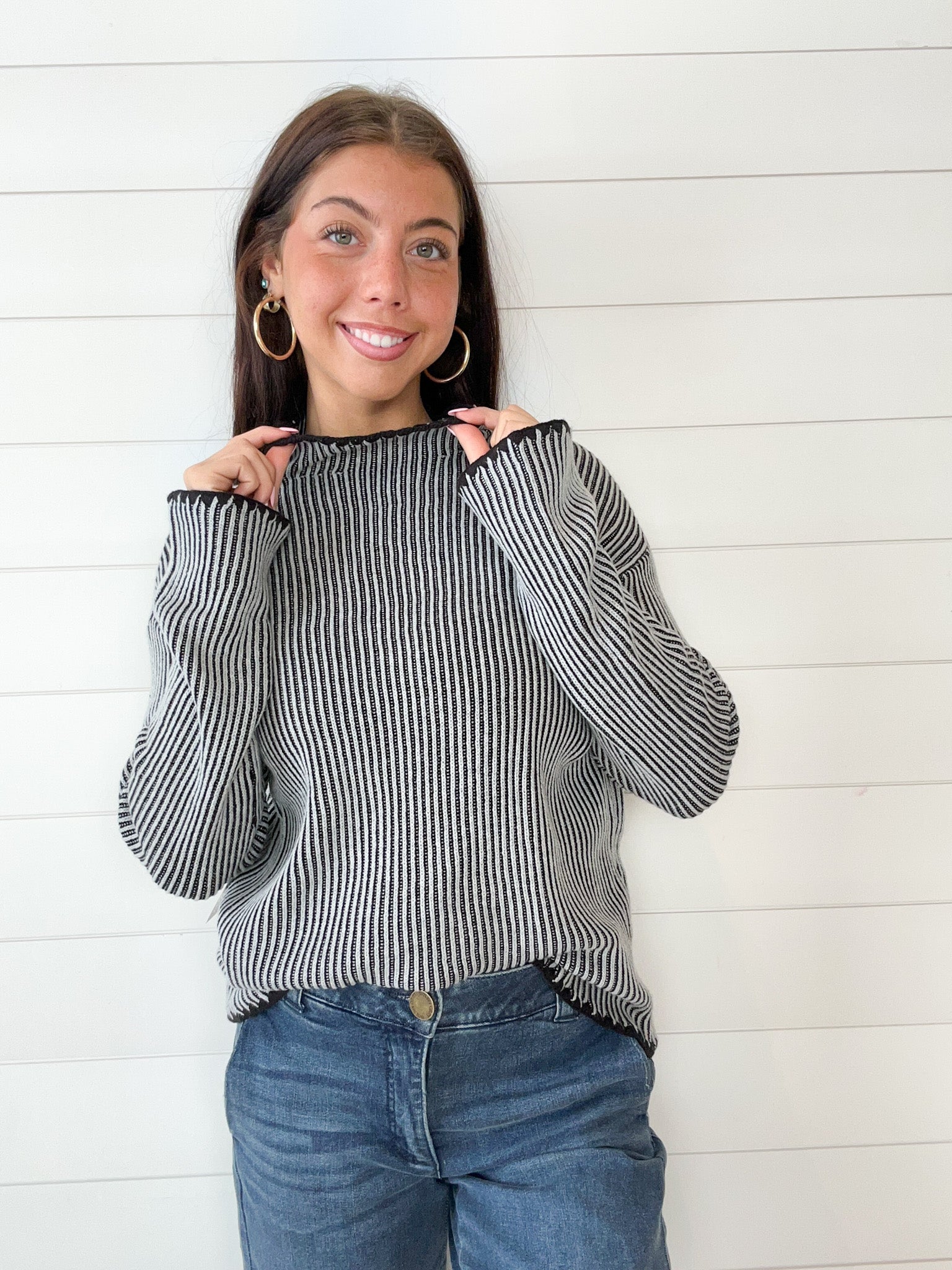 This lightweight funnel neck sweater is the perfect blend of structure and sweetness. Crafted from 100% cotton with tonal beige ribbing, it features a soft mock neckline, relaxed drop shoulders, and a touch of feminine flair with delicate embroidered scallop details along the hem and cuffs.