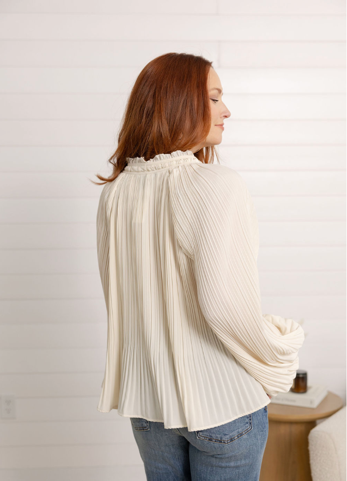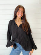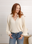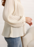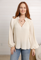 Elevate your everyday wardrobe with the MB Split Neck Plisse Blouse. Crafted from lightweight plissé polyester, it features a split neckline with a subtle ruffle, flowing poet sleeves, and a relaxed, airy silhouette that drapes beautifully. Perfect for dressing up or keeping it casual, this blouse adds effortless elegance to any outfit.