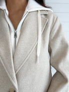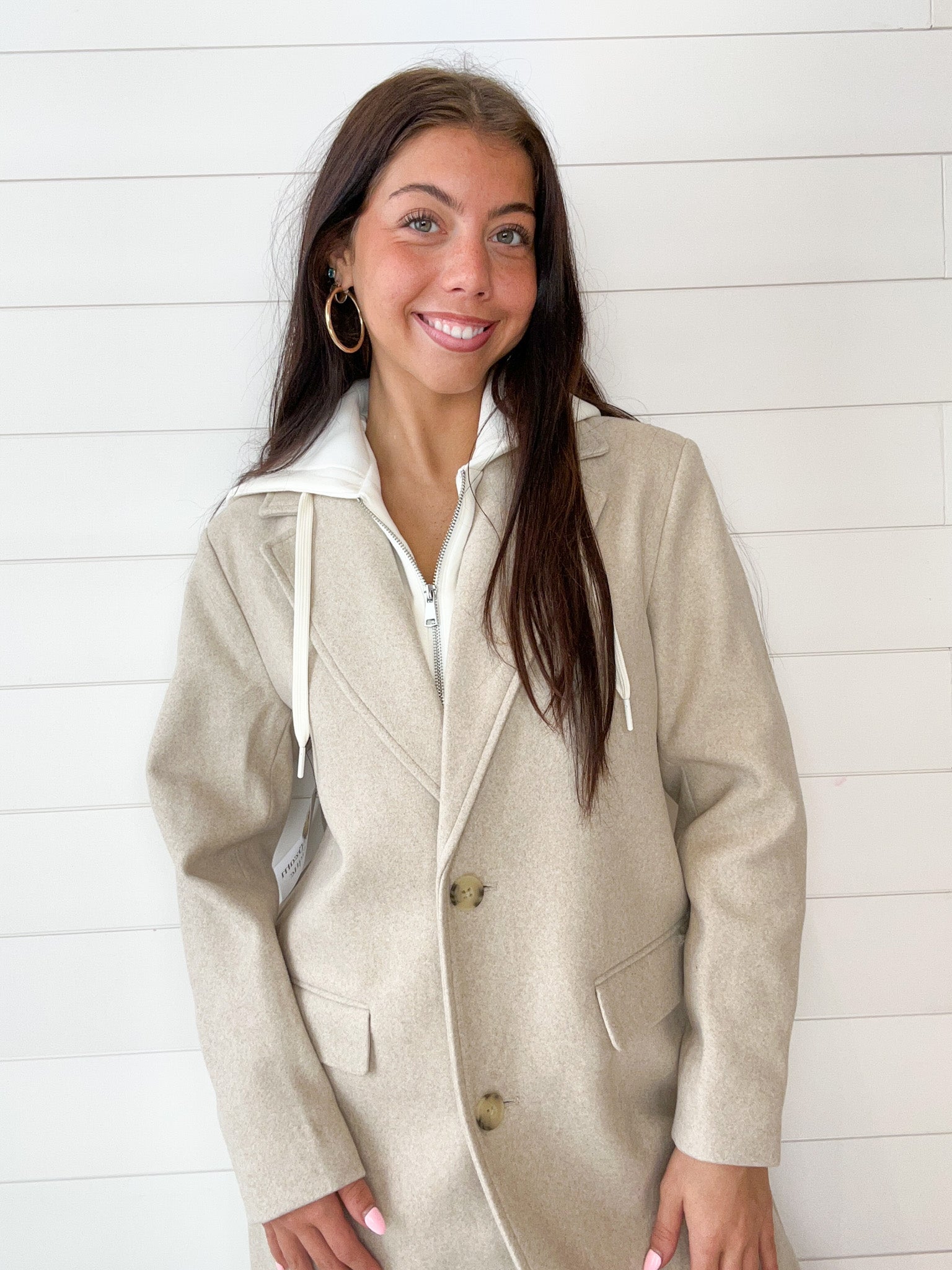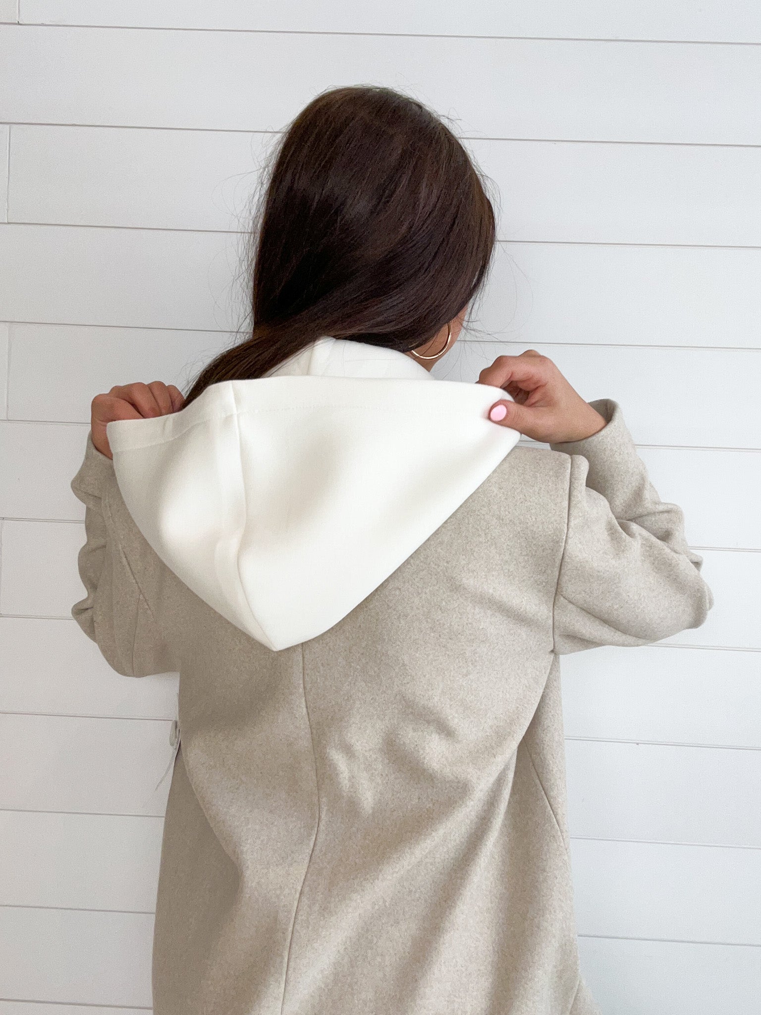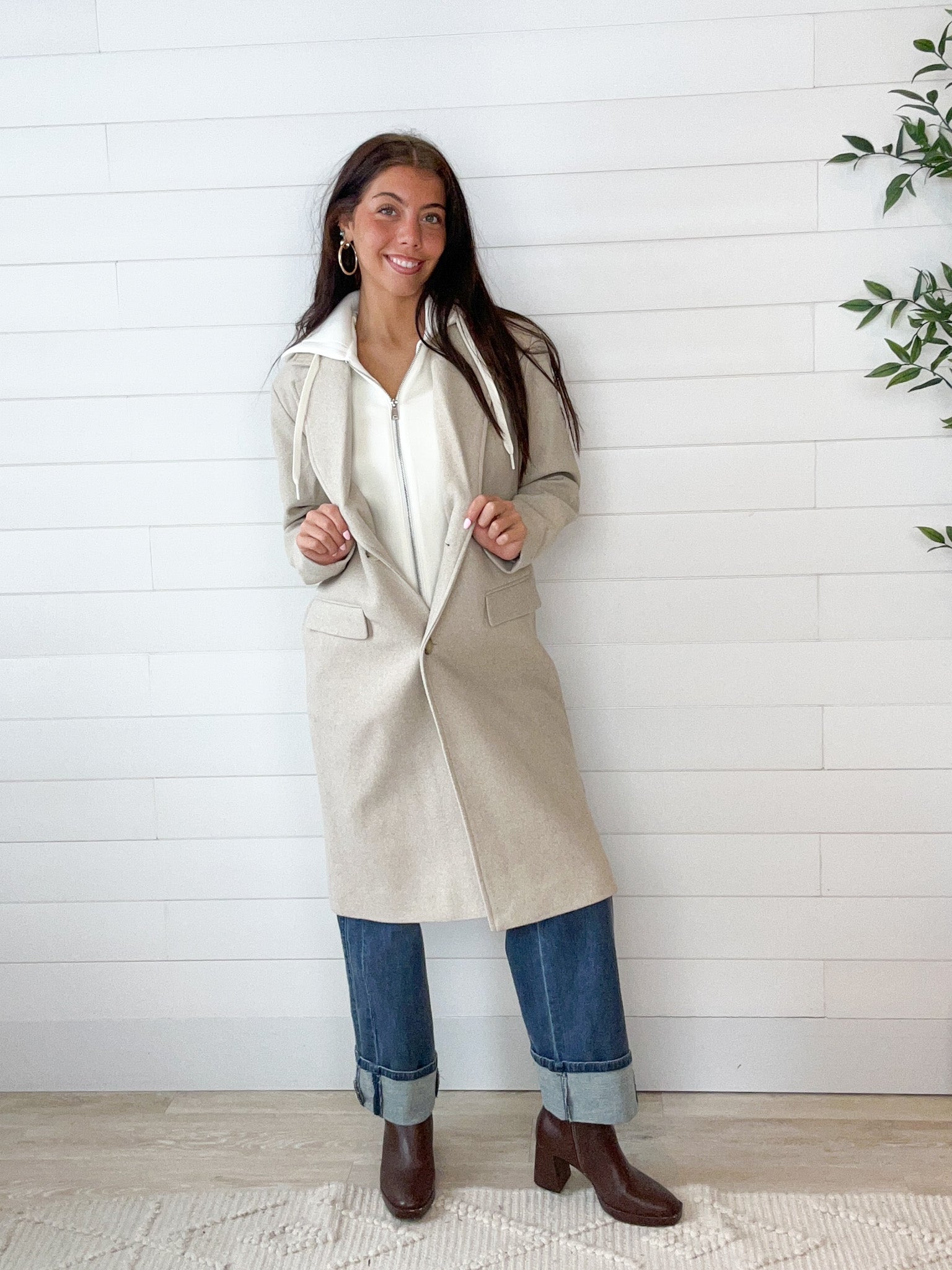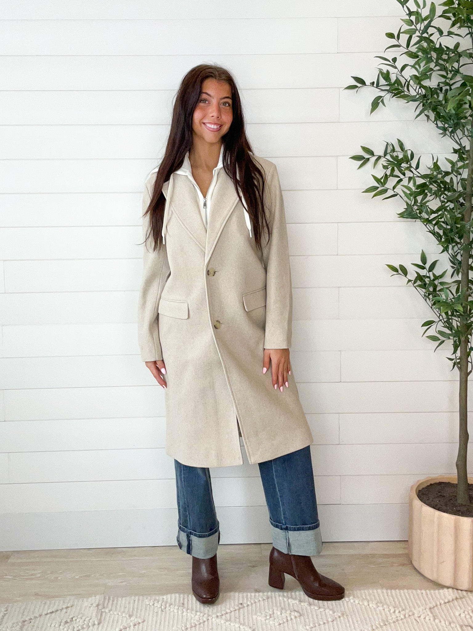 Elevate your outerwear game with a modern car coat reimagined with a removable fooler hoodie for a layered, street-style edge. The buttoned front and sharp notch lapels lend timeless sophistication, while side pockets offer functional ease, blending utility and style for an effortlessly polished finish. Can be dressed-up or dressed down by adding or simply removing the hoodie.