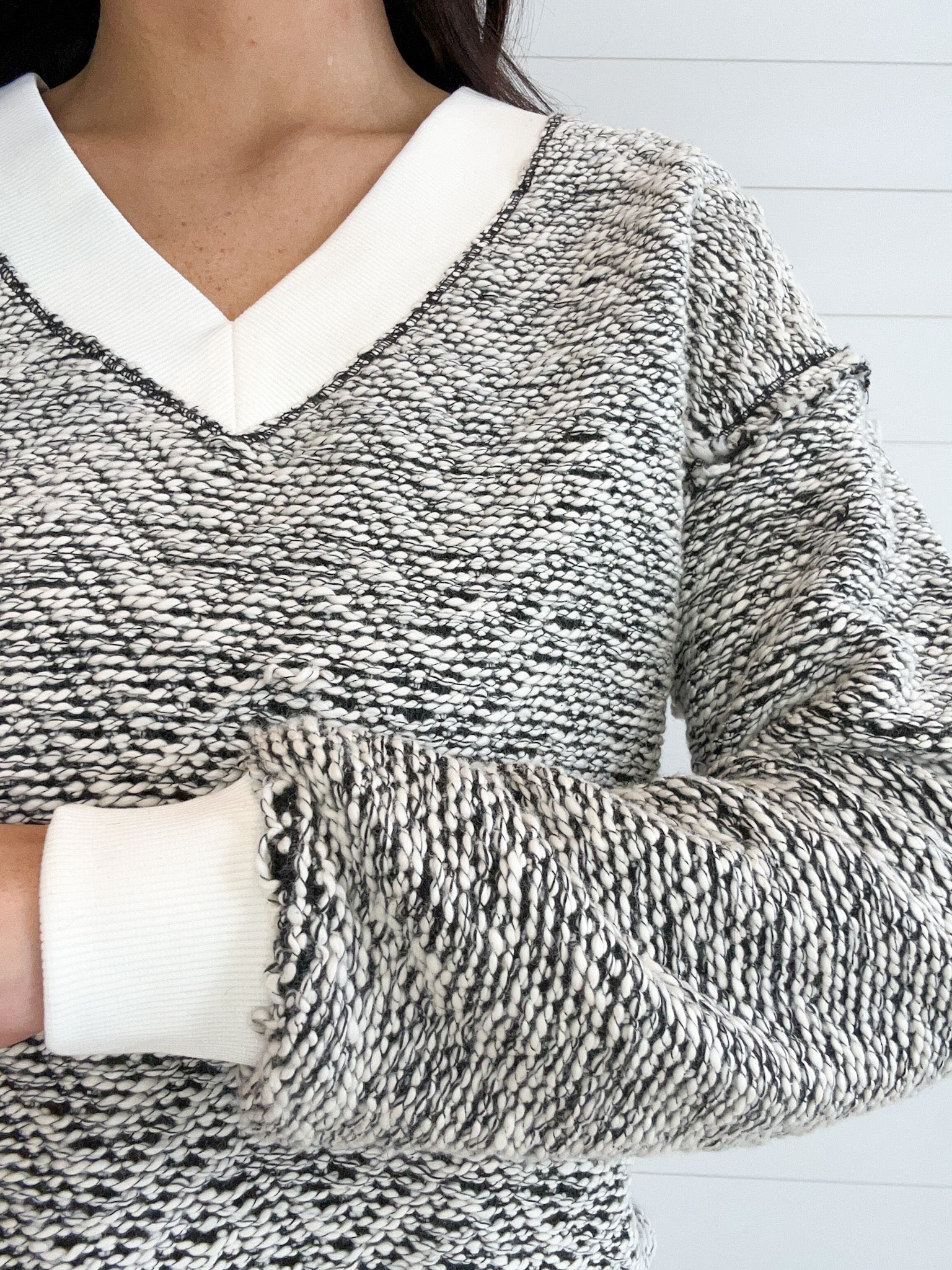 Wrap yourself in cozy comfort with a lightweight top crafted from eye-catching two-tone textured yarn for a modern twist on knitwear. Long sleeves and drop shoulders create a relaxed silhouette, while ribbed detailing at the hem, cuffs, and V-neckline adds a refined, polished finish.