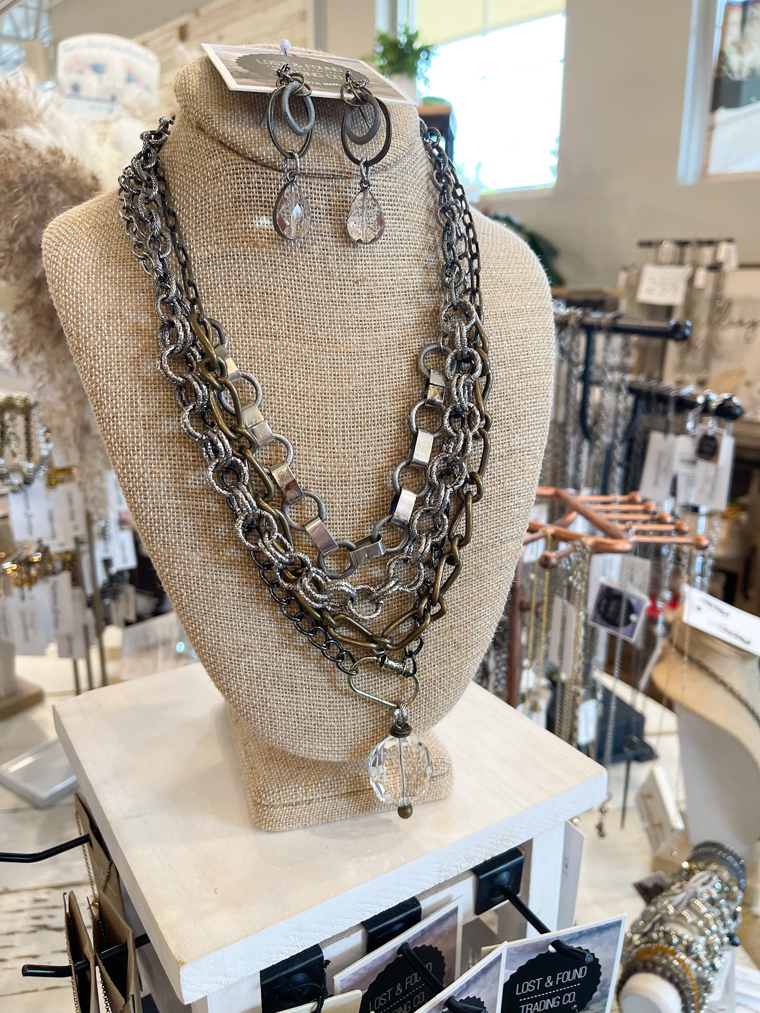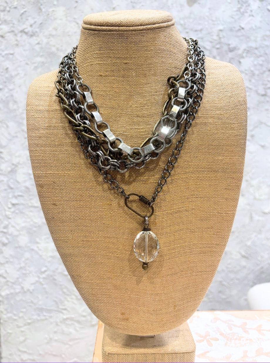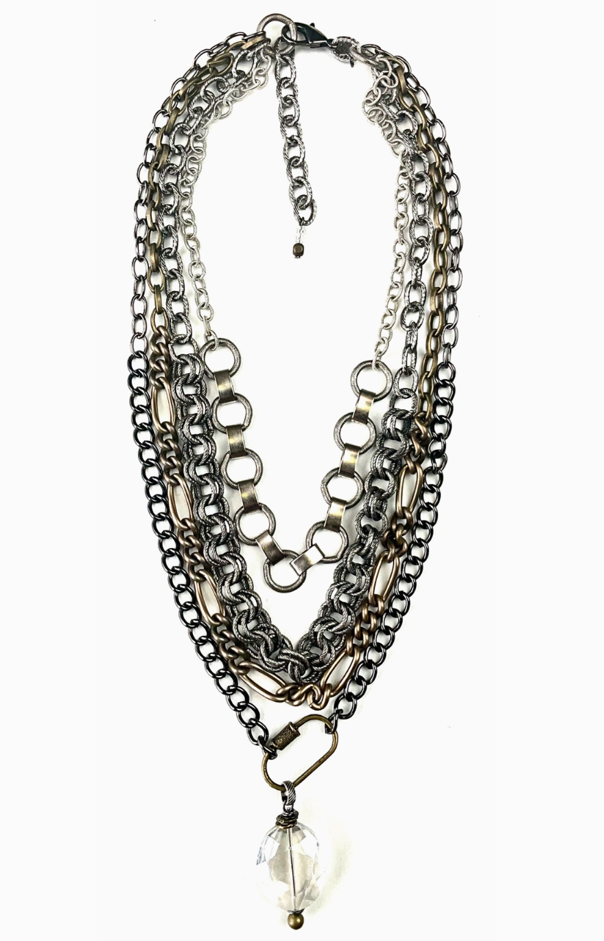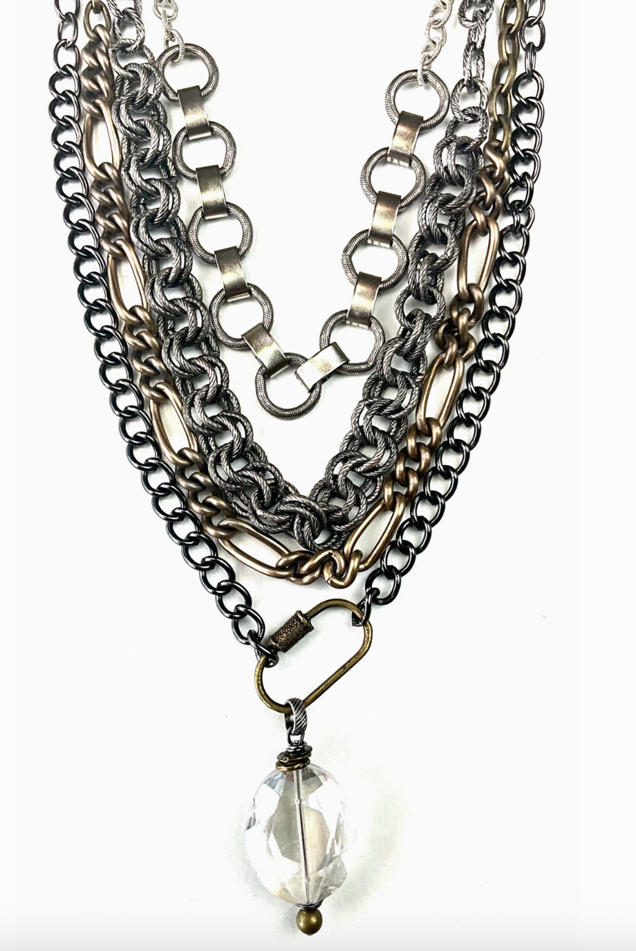 Mixed Chains Multi Strand W/Carabiner and Glass Front Necklace