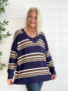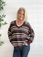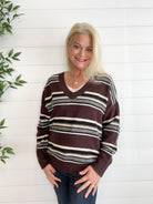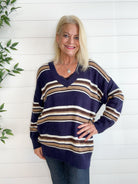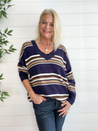 Add a touch of classic style to your wardrobe with this Multicolor Stripe V-Neck Sweater! Crafted from a cozy blend of 77% acrylic, 20% nylon, and 3% spandex, it’s soft, stretchy, and ready for whatever the day throws at you. The classic stripes and flattering V-neck bring a sporty vibe, perfect for layering or wearing solo. Brighten up chilly days with great style and comfy warmth all in one!