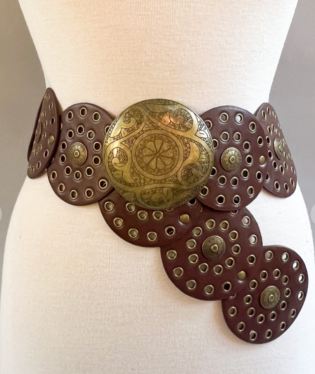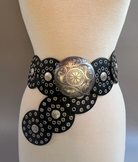 Western-inspired belt, with round discs, metal studs, and a big, coin buckle. Each disc has a diameter of 3.5" Length: 39.7 in / 101cm