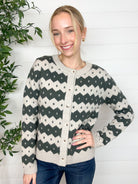 Wrap yourself in winter charm with the Nordic Diamond Stripe Cardigan — a cozy knit that feels like a warm hug on a chilly day. With rows of diamonds and tiny dotted centers across the body, this sweater has that classic, ski-lodge-meets-street-style vibe. The slightly thicker knit adds a luxe, comfy feel, while the button-up front and crew neckline keep it timeless and easy to layer.