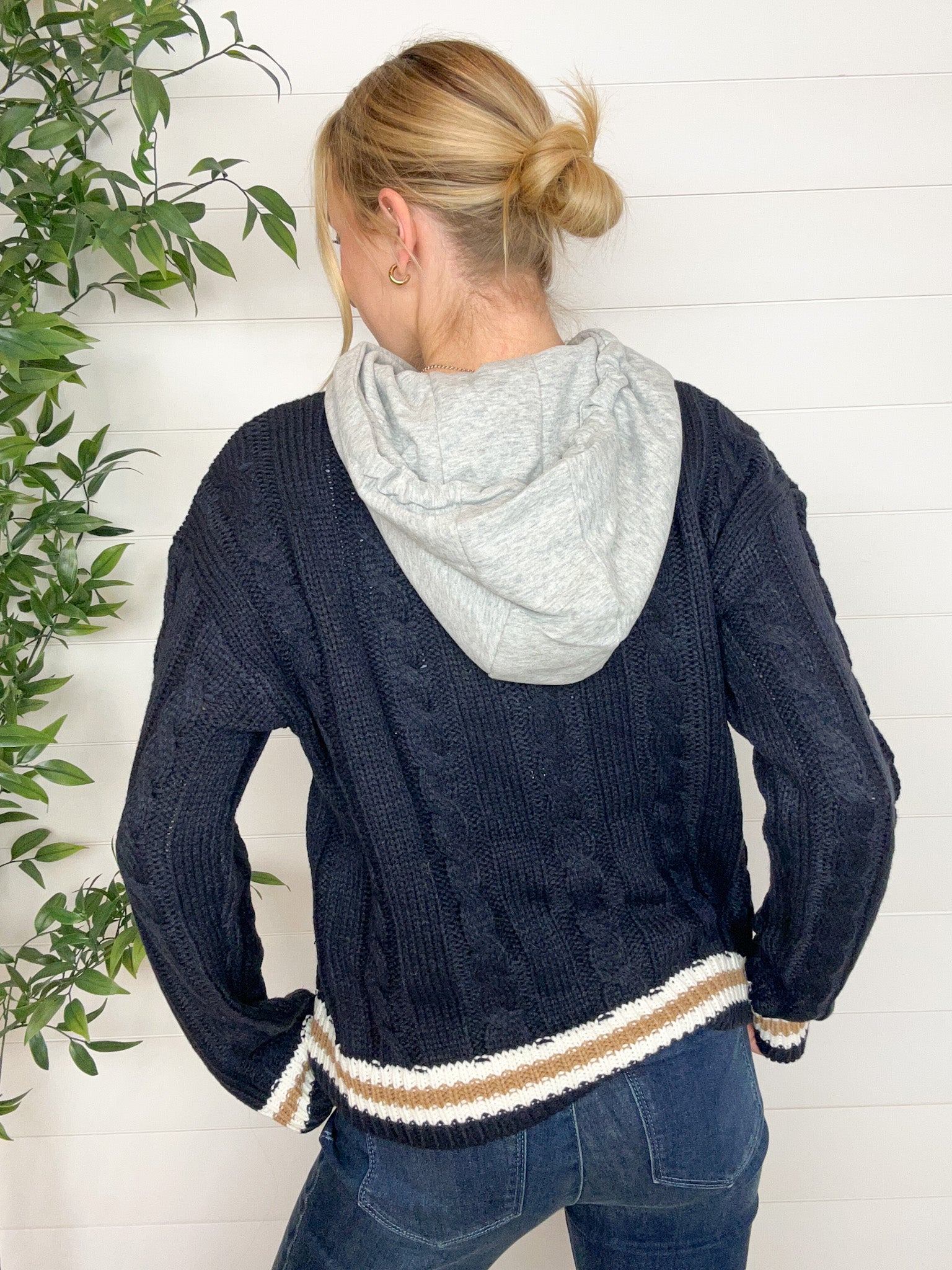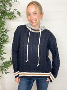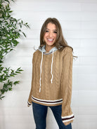 The Preppy Cable Knit Hoodie blends classic charm with casual cool. Featuring a heather grey hoodie-style hood and traditional cable knit body, this sweater is finished with varsity-inspired striping along the neckline, cuffs, and hem. With just the right amount of stretch, it’s the perfect mix of cozy and chic — whether you’re heading to brunch or just keeping it cute on a casual day out.