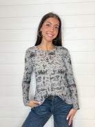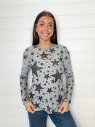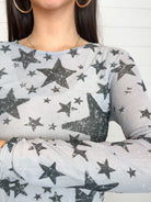 The Printed Rhinestone Detail Mesh Top is the ultimate blend of edge and sparkle. Available in two standout prints—distressed stars or a western motif—it’s sprinkled with micro silver rhinestones that shimmer with every move. The long sleeves and lightweight mesh make it perfect for layering over a bralette, under a jacket, or paired with your favorite high-rise denim. Equal parts bold and versatile, this top was made to shine day or night.