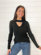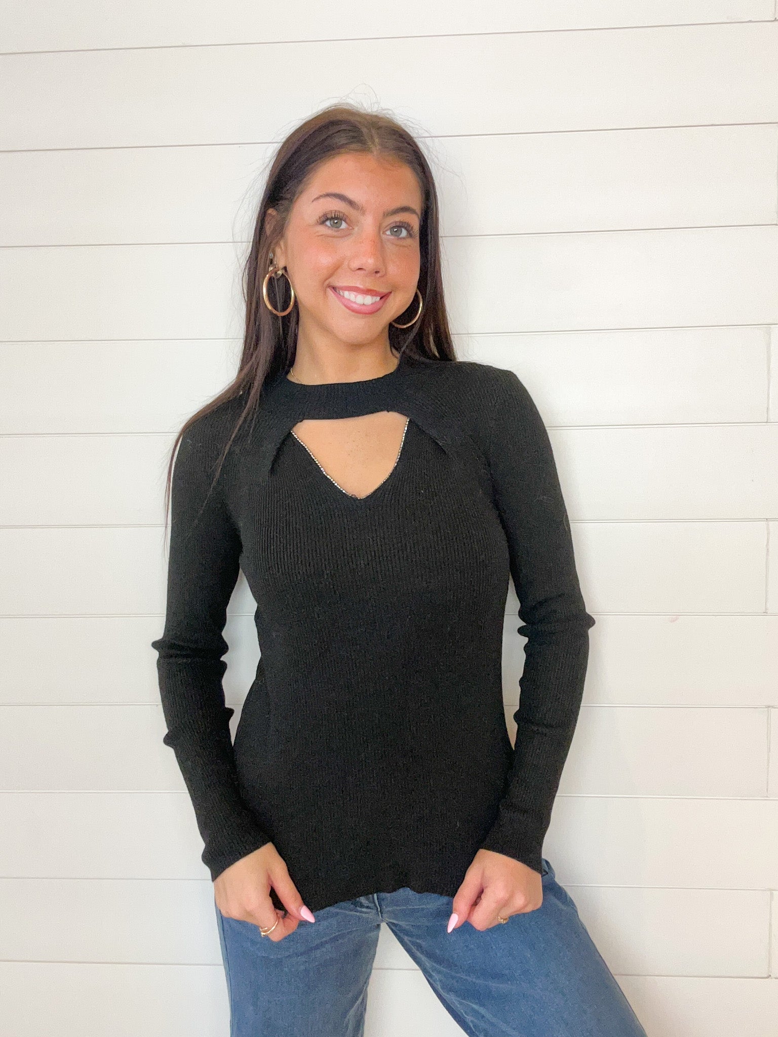 The Rhinestone Trim Keyhole Sweater takes cozy-chic to a whole new level. Designed in a soft, lightweight ribbed knit, this sweater balances comfort with just the right amount of glam. A mock neckline keeps it polished, while the chest cut-out creates a flattering V-shape edged with rhinestones that catch the light with every move. Long sleeves and a body-skimming fit make it a versatile piece you’ll love for both day and night—whether you’re dressing it up with a skirt or keeping it casual with jeans.