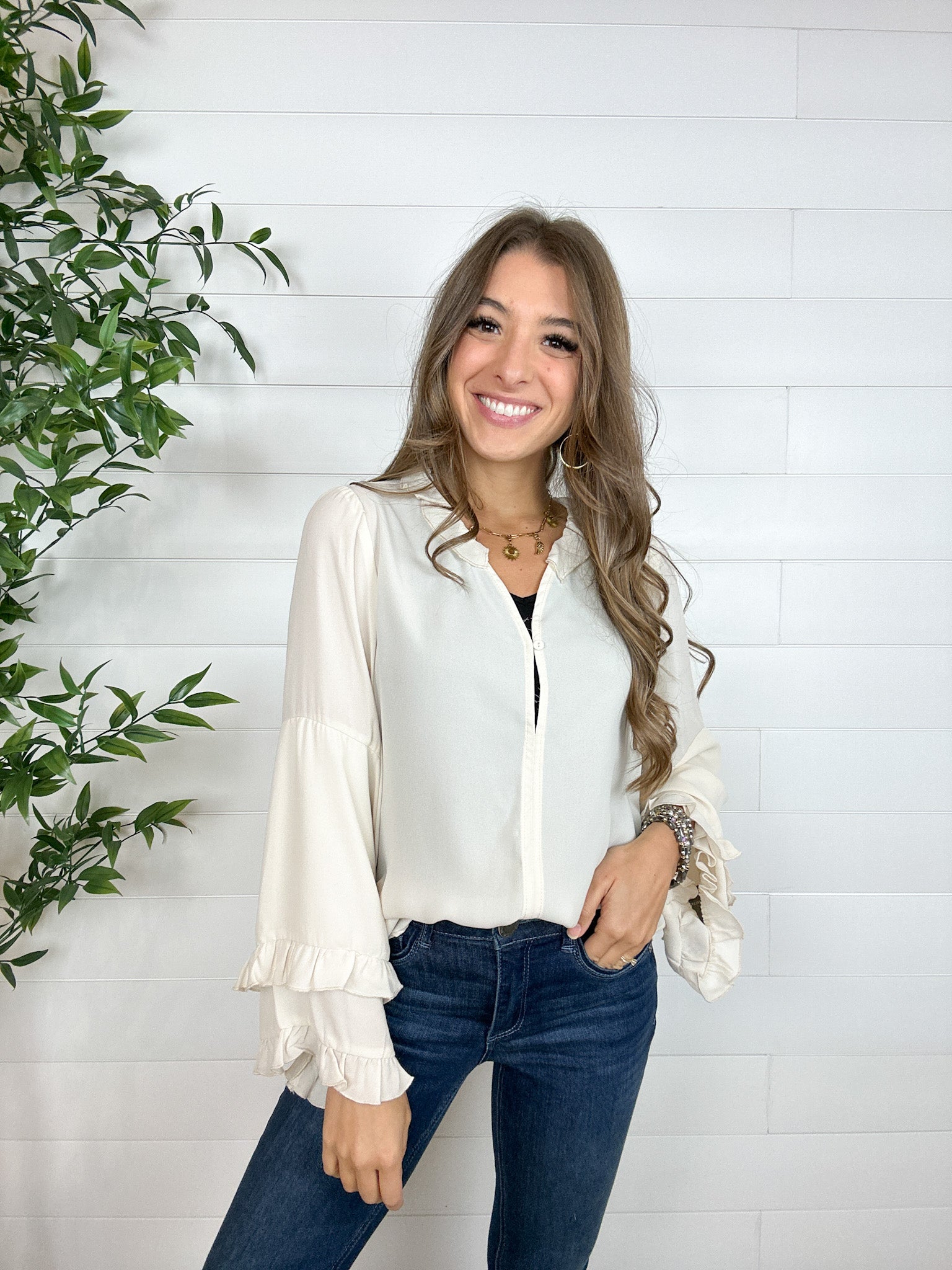 Soft, fluttery, and effortlessly elegant — the Romantic Ruffle Sleeve Top brings a dreamy touch to any outfit. With its flowing double ruffle sleeves and split V-neck framed in delicate gathers, this woven beauty captures the essence of femininity. The slightly sheer fabric and gentle drape make it a perfect pick for date nights, brunches, or any time you want to feel extra lovely.