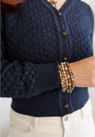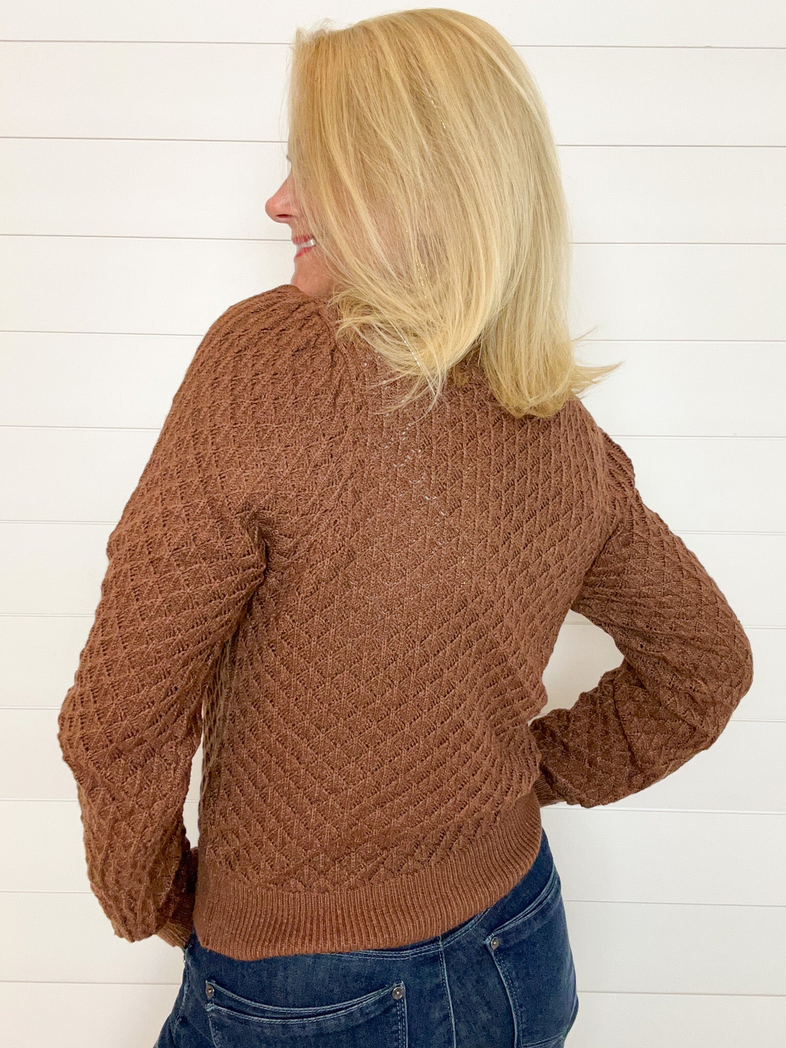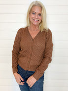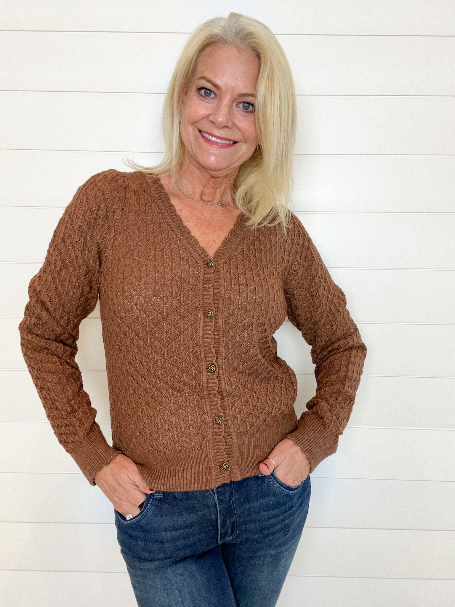 The Rose Button Pointelle Cardigan is all things soft, sweet, and timeless. Designed in a delicate pointelle knit, it features romantic rose-shaped buttons down the front and a flattering V-neckline that pairs beautifully with your favorite camis and dresses. Ribbed trim and gently puffed shoulders complete the feminine, vintage-inspired silhouette.