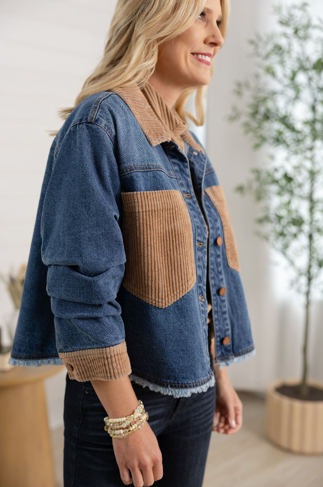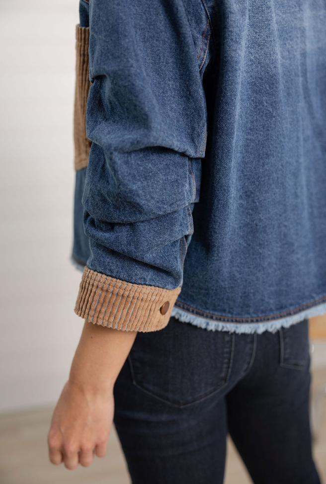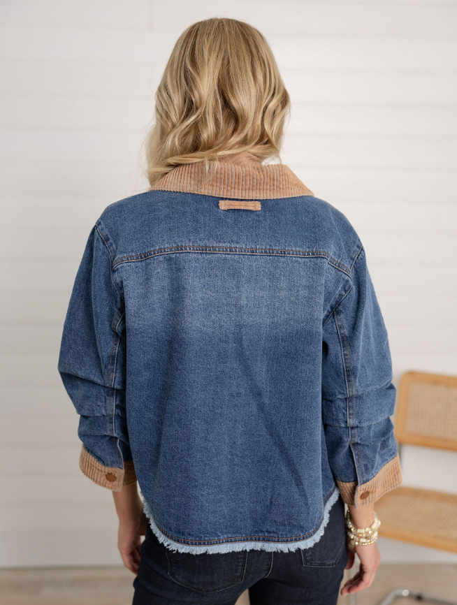 The perfect combination between stylish and comfy, this mixed media denim jacket has all the details you’re looking for. It has three quarter ruched sleeves, a collar neck, button front, oversize pockets, and a curved fray hem.