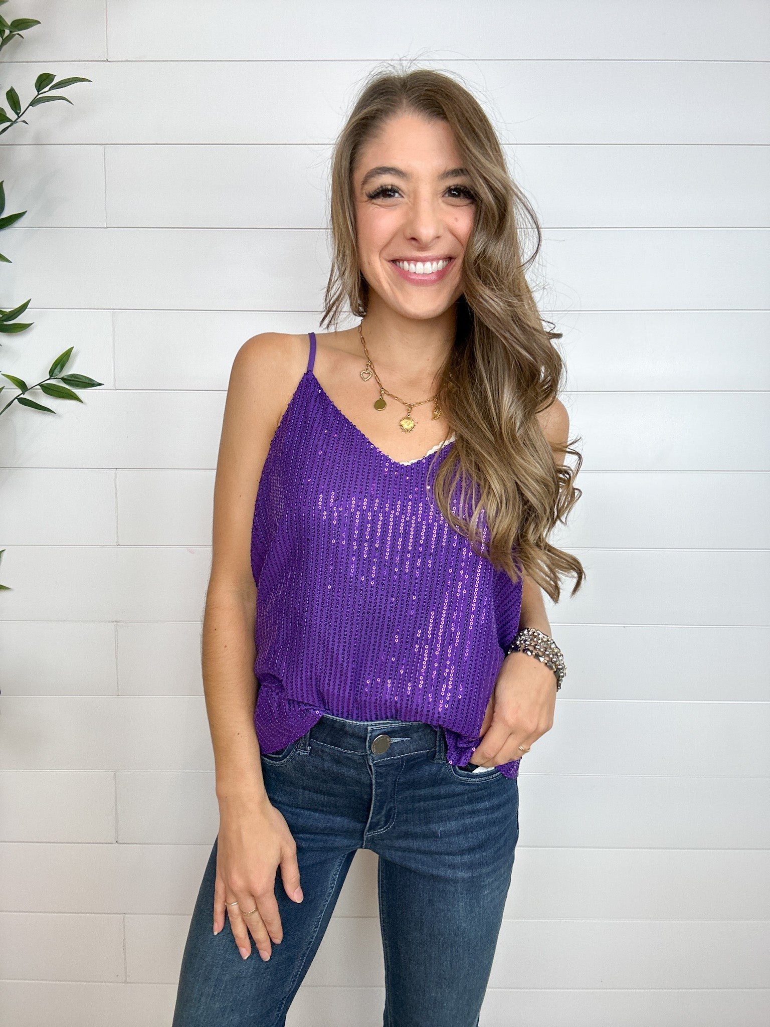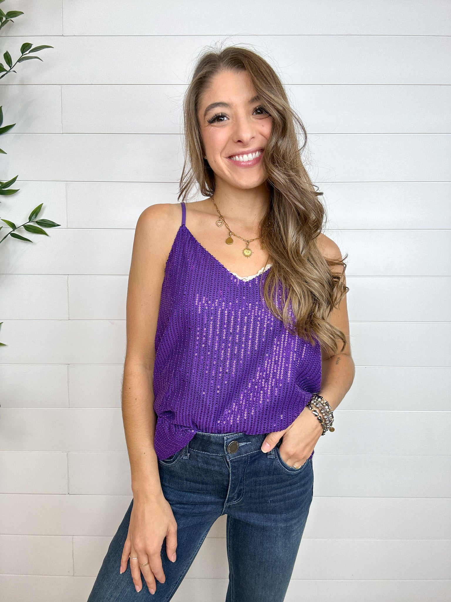 Our Sequin Swing Tank is here to light up your look! This sparkly little number features a loose, flowy fit that catches the light just right, making it perfect for parties, date nights, or layering under a blazer for a glam pop. With adjustable straps and a full lining, it’s as comfortable as it is eye-catching.